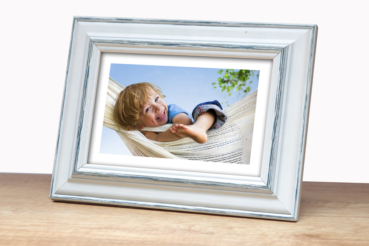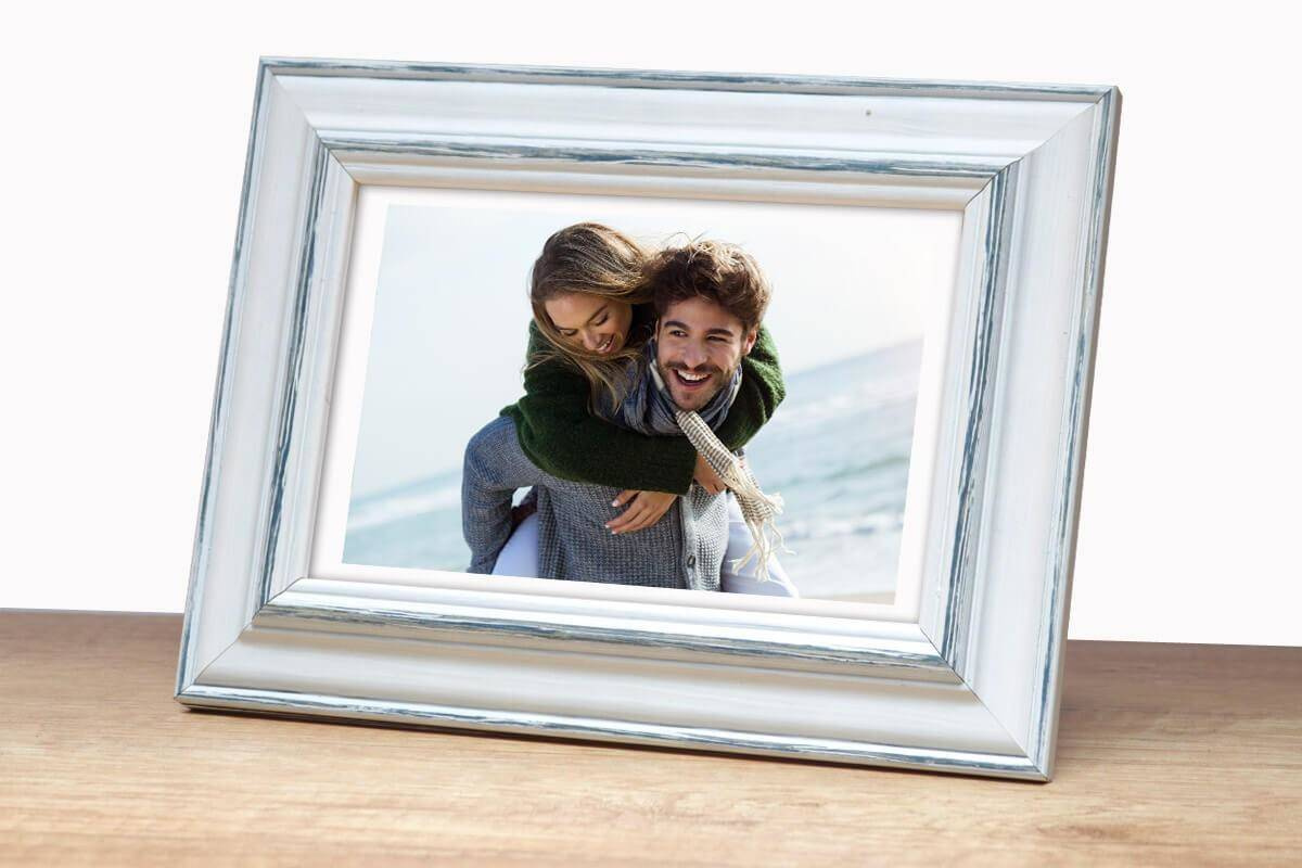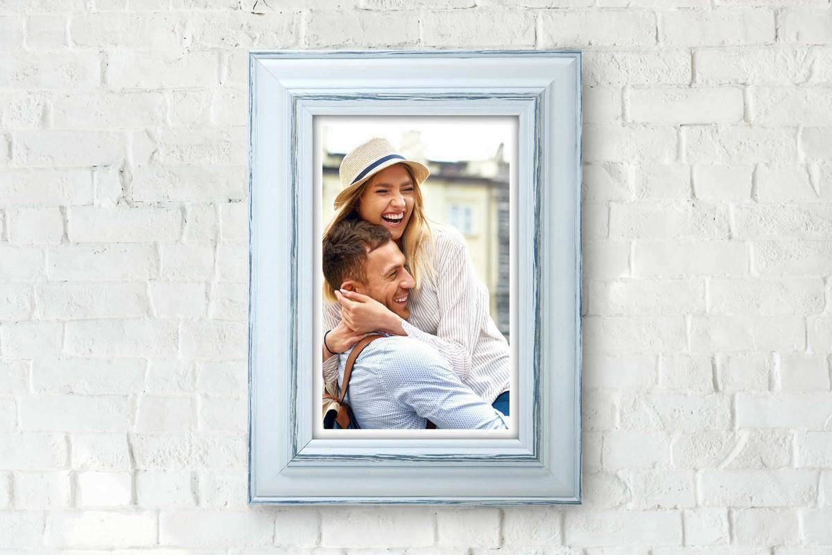 Rustykalna fotoramka w biało-niebieskim kolorze z przetarciami o przekroju profilu 30x15 mm wykonana w 100% z drewna. Przeznaczona jest do oprawy fotografii, plakatów i dyplomów. W zależności od formatu wyposażona jest w szkło mineralne lub bezbarwne szkło organiczne - wysokiej jakości plexi. Plecki wykonane są z twardej płyty HDF. Ramki na zdjęcia do rozmiaru 18x24 cm dodatkowo posiadają stopkę / nóżkę która pozwala eksponować oprawiony obraz na biurku lub regale. Ramka drewniana MAROTTA dostępna jest w rozmiarach od 10x15 cm do 50x70 cm.