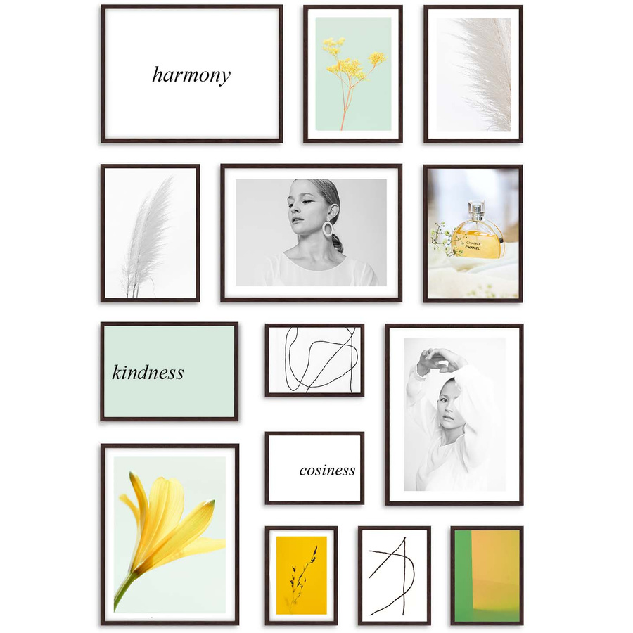 Nowoczesna galeria ścienna Pinia 4 GF0001 składająca się z trwałych, wysokiej jakości ramek wykonanych całkowicie ze starannie dobranego polskiego drewna. Tak w 100% z litego drewna! - nie jest to drewnopochodny MDF prasowany z lepikami wiór oklejany papierem. Ambitny, profilowany kształt przekroju ramki nadaje mu lekkości i elegancji. Profil drewniany o przekroju 14x11 mm jest bardzo stabilny, a zastosowane do połączenia zszywki typu „V-nail” gwarantują doskonale spasowane narożniki co sprawia, że oprawione pamiątki będą cieszyły oko przez długi czas. Ramki w zastawie z kolekcji Pinia 4 GF0001 charakteryzują się subtelnym wyglądem i szerokim wachlarzem kształtów od prostych mini galerii do rozbudowanych zestawów. Dostępne są w wielu wersjach kolorystycznych od neutralnej białej, zawsze eleganckiej czerni, ciepłego naturalnego drewna, uniwersalnego brązu, w odcieniach szarości.