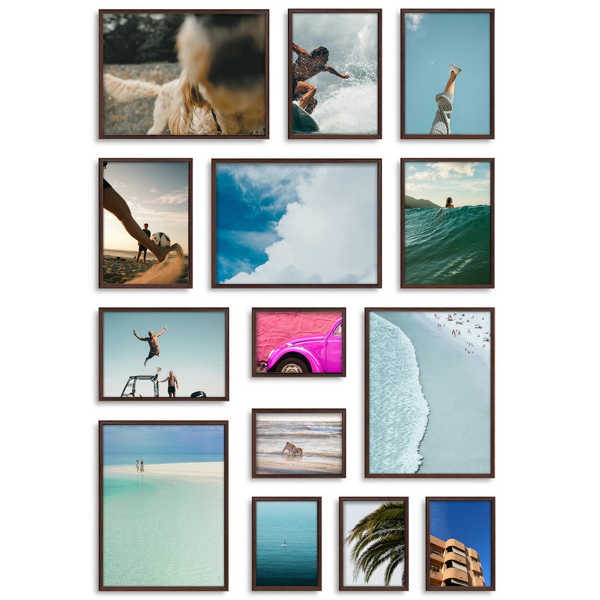 Rozmiar całkowity kompozycji: 144 x 98 cm Orientacja: możliwość aranżacji pozioma i pionowa Ramki: starannie wykonane w 100% z drewna sosnowego, trwale połączone poprzez V-nail. Przód oprawy: szkło mineralne o wysokiej przejrzystości, w zależności od rozmiaru ramki o grubości od 1,5 – do 2 mm. Tył oprawy: wykonany jest z twardej obustronnie gładkiej płyty HDF o grubości 1,8 – 2,5 mm. Blaszki mocujące: miękkie blaszki mocujące tył ramki, zapewniają możliwość wielokrotnego otwierania. Wieszak: stabilna metalowa zawieszka z możliwością ekspozycji pionowo lub poziomo. Akcesoria: szablon papierowy wydrukowany w skali 1:1, komplet wkrętów i kołków, mini poziomica, instrukcja, zestaw nie zawiera zdjęć i grafik. Opakowanie: ramki posiadają zabezpieczające narożniki tekturowe oraz folię ochronną. Gwarancja satysfakcji: Najwyższa jakość, gatunek I. Produkt polski.
