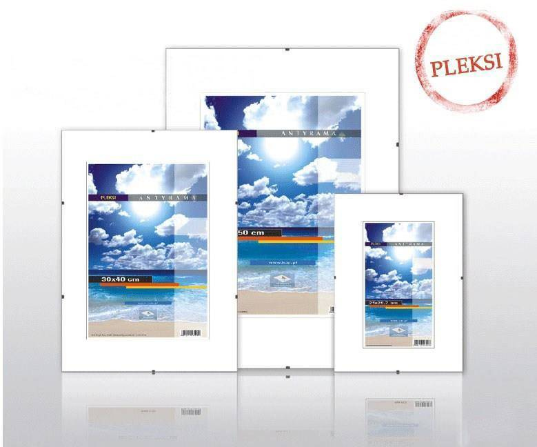 Antyrama - nowoczesna prosta forma oprawy, zapewnia łatwy montaż oraz możliwość wielokrotnego wykorzystania. Przeznaczona jest do wyeksponowania fotografii, plakatów i dyplomów. W zależności od formatu wyposażona jest w szkło mineralne lub bezbarwne szkło organiczne - wysokiej jakości plexi. Plecki wykonane są z twardej płyty HDF. Antyrama plexi dostępna jest w rozmiarach od 21x29,7 cm do 70x100 cm.