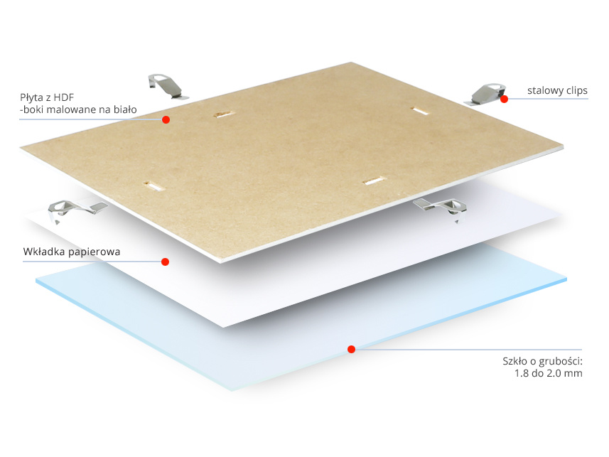 Szkło - wysokiej jakośći oraz odpowiedniej grubości. Klipsy do antyram - wykonane z najwyższej jakości stali przez co nie ulegają złamaniom i zniekształceniom. Plecy do antyram - płyta pilśniowa zastąpiona przez twardszą płytę HDF. Przy większych formatach stosowana jest grubsza płyta. Opakowanie - każda antyrama wyposażona jest w indywidualny karton tekturowy.
