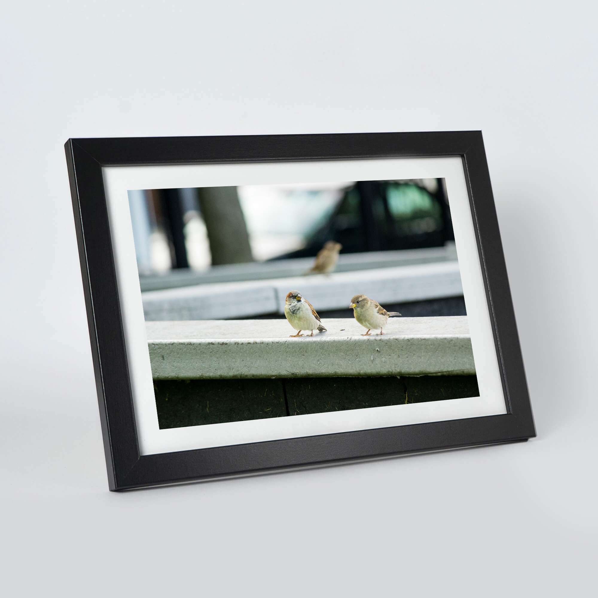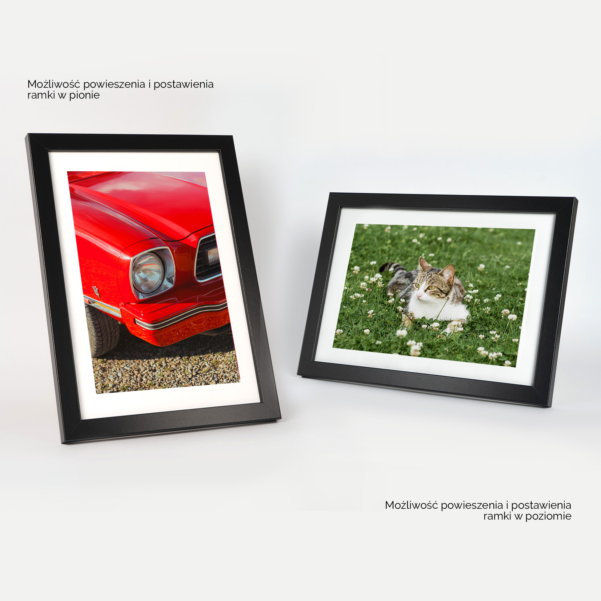 - Montaż: Możliwość zawieszenia ramki w pionie lub poziomie, dzięki metalowej zawieszce, a w mniejszych formatach także postawienia na biurku za pomocą tylnej stopki.