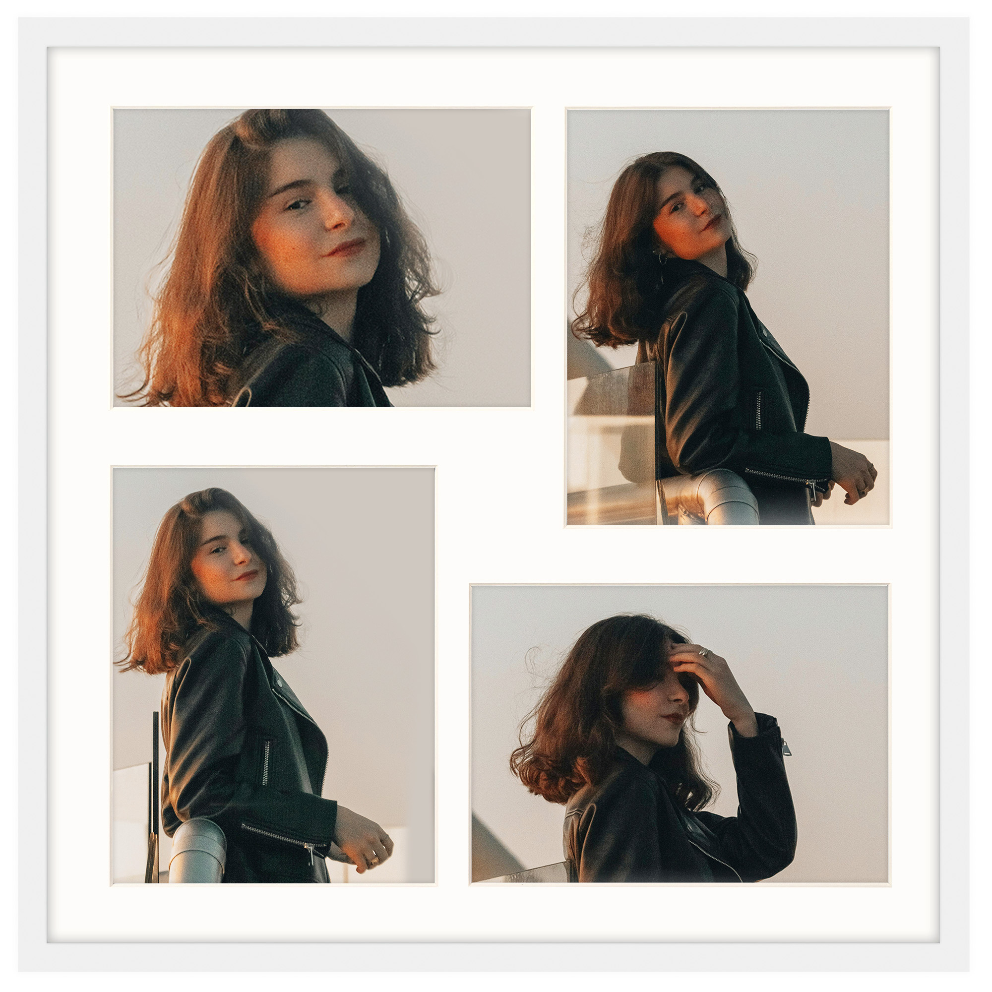 Nowoczesna, prosta w formie ramka na 4 zdjęcia wykonana z ekologicznego MDF, foto galeria w białym kolorze o przekroju profilu ramy 13x20 mm. Doskonała propozycja do oprawy czterech zdjęć w jednej ramie. Foto galeria wyposażona jest w jasne passe partout, które pozwala na umieszczenie 4 fotografii w rozmiarze 13x18 cm. Foto galeria M1 40x40 dostępna jest również w innych kolorach: czarnym, dębowym i brązowym.