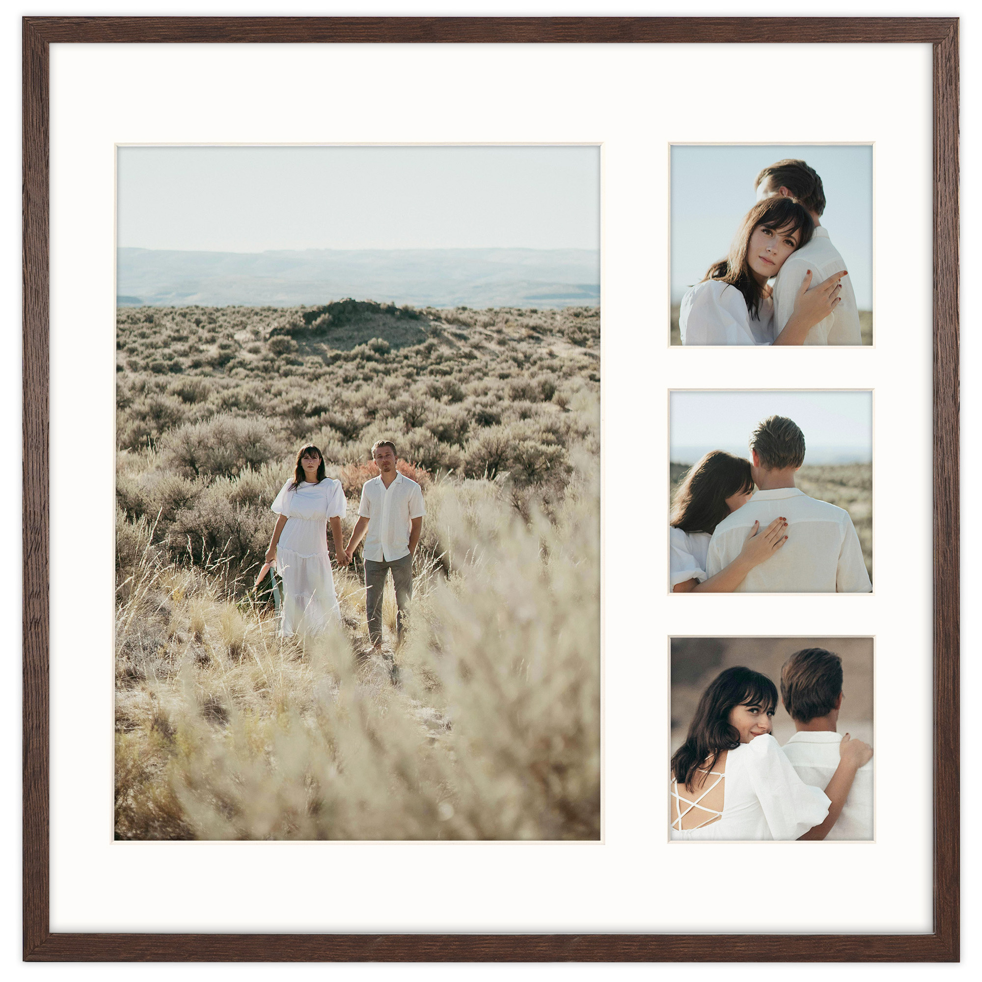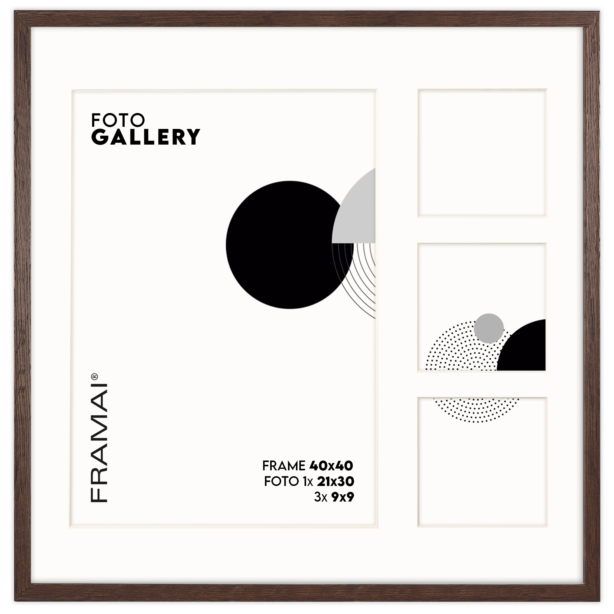 Foto Galeria na 4 zdjęcia - FG-M6 40x40 cm (wymiar ramy wewnętrzny) odpowiednia do oprawy jednego zdjęcia o formacie 21x30 cm i trzech zdjęć o formacie 9x9cm. Kolor ramki brązowy