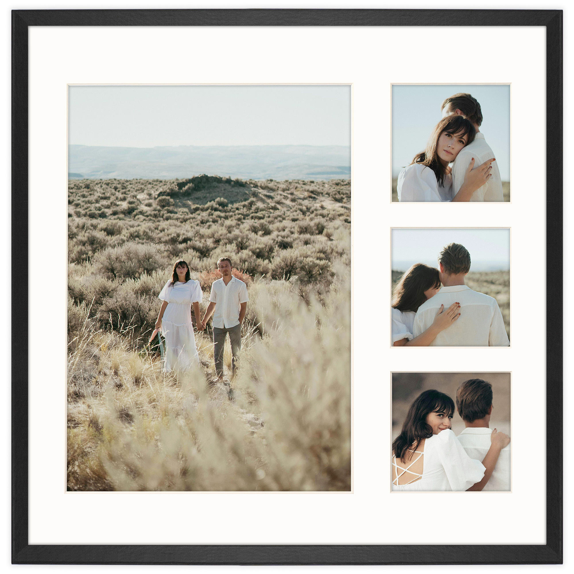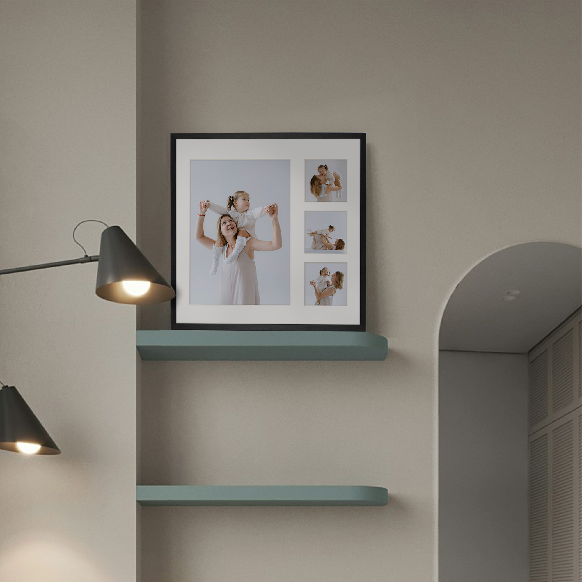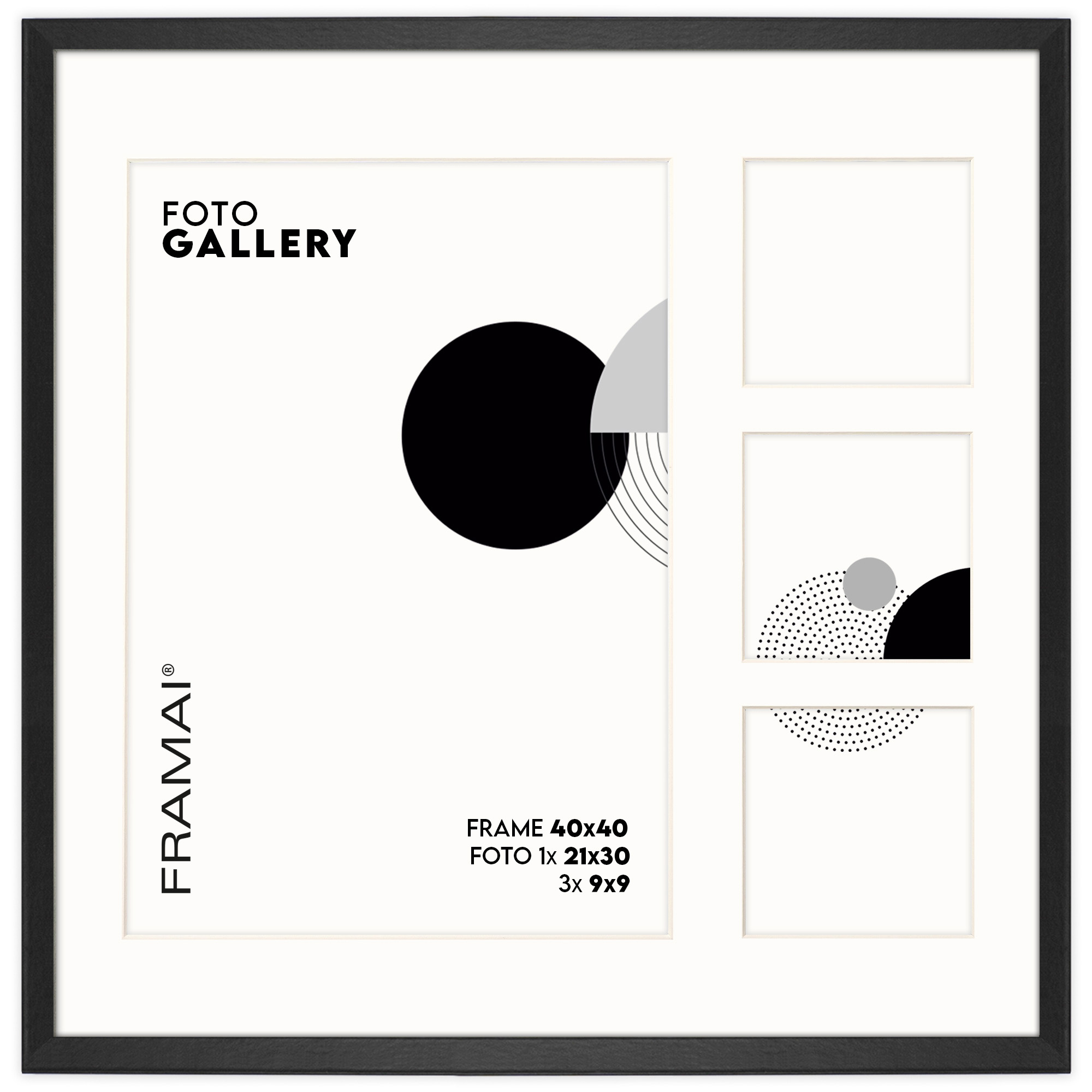 Foto Galeria na 4 zdjęcia - FG-M2 40x40 cm (wymiar ramy wewnętrzny) odpowiednia do oprawy jednego zdjęcie o formacie 21x30 cm i trzech zdjęć o formacie 9x9cm. Kolor ramki czarny