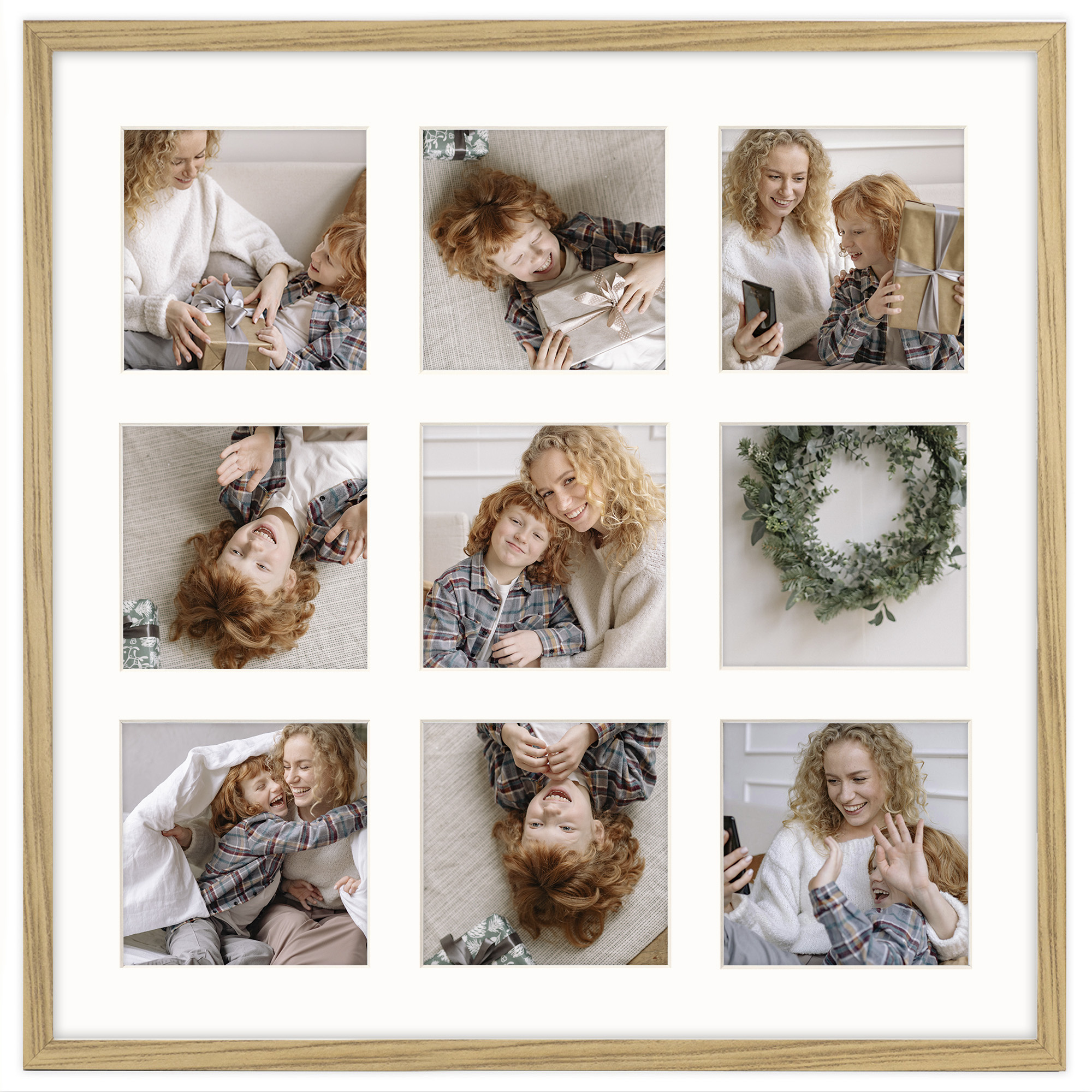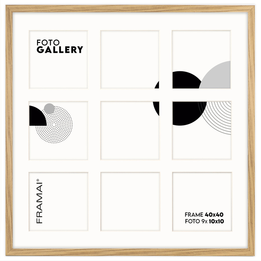 Foto Galeria na 9 zdjęcia - FG-M02 40x40 cm (wymiar ramy wewnętrzny) odpowiednia do oprawy dziewięciu zdjęć o formacie 10x10 cm. Kolor ramki dębowy