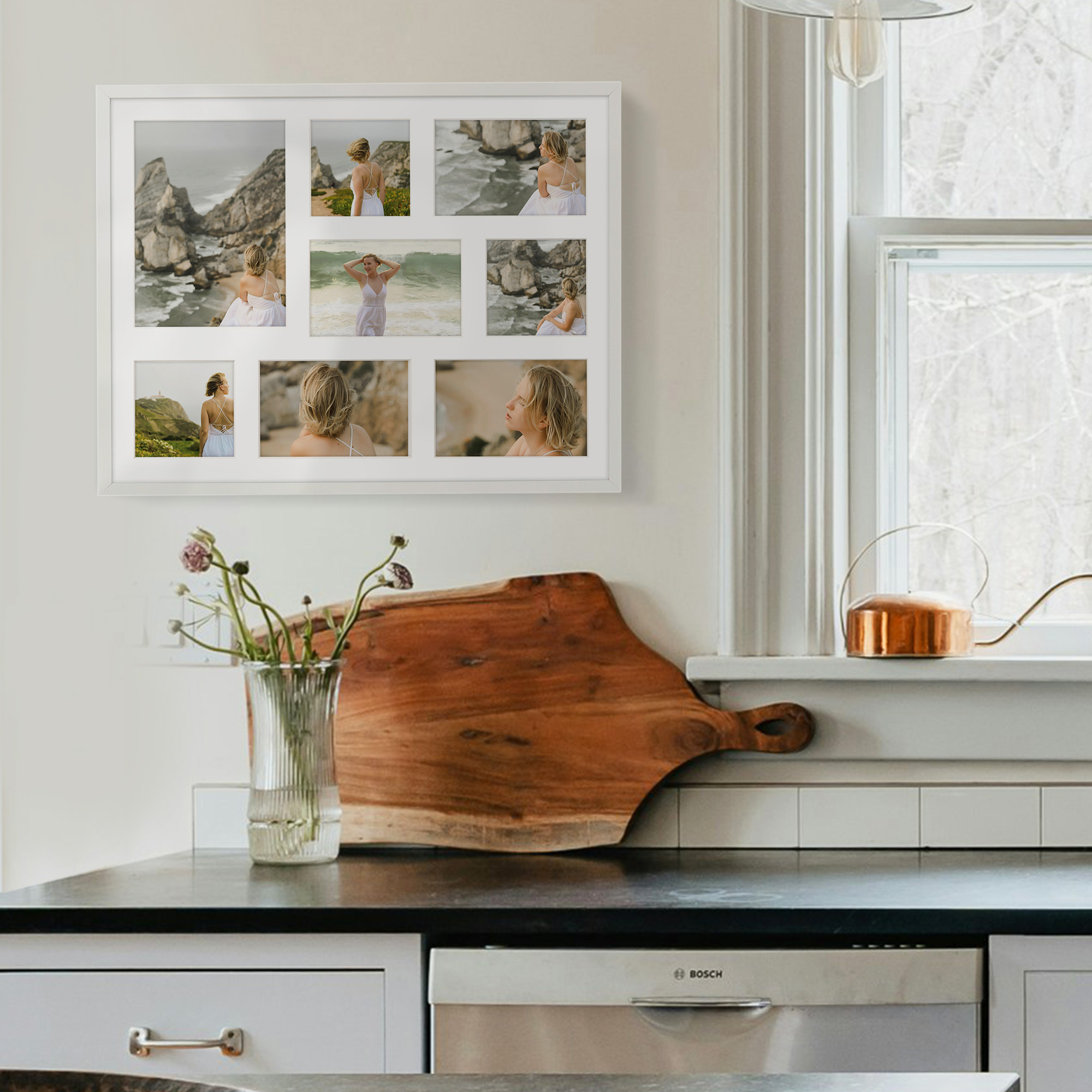 Foto Galeria na 7 zdjęć - FG-M1 40x50 cm (wymiar ramy wewnętrzny) odpowiednia do oprawy siedmiu zdjęć o formatach 10x10 cm, 10x15 cm i 15x21 cm. Kolor ramki biały