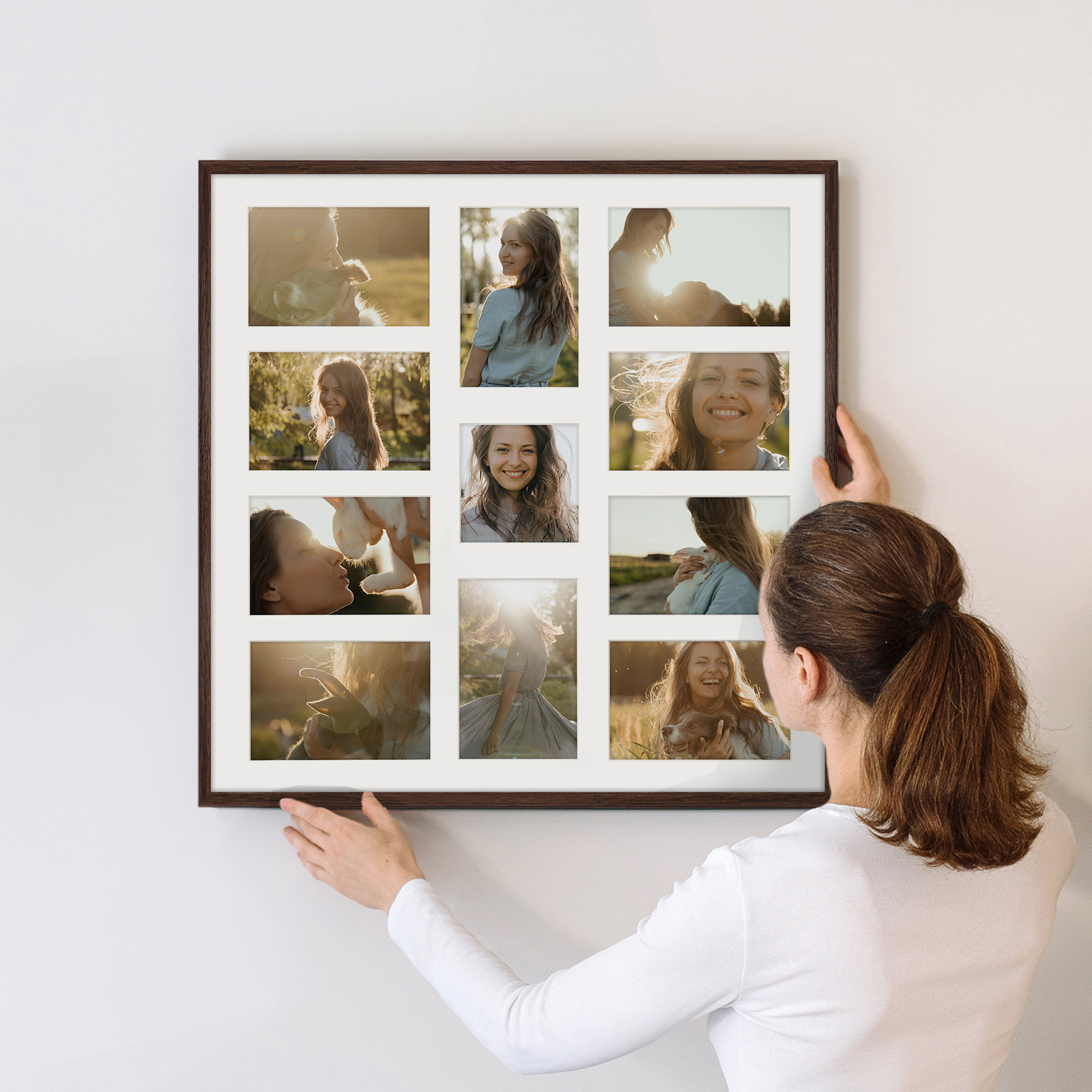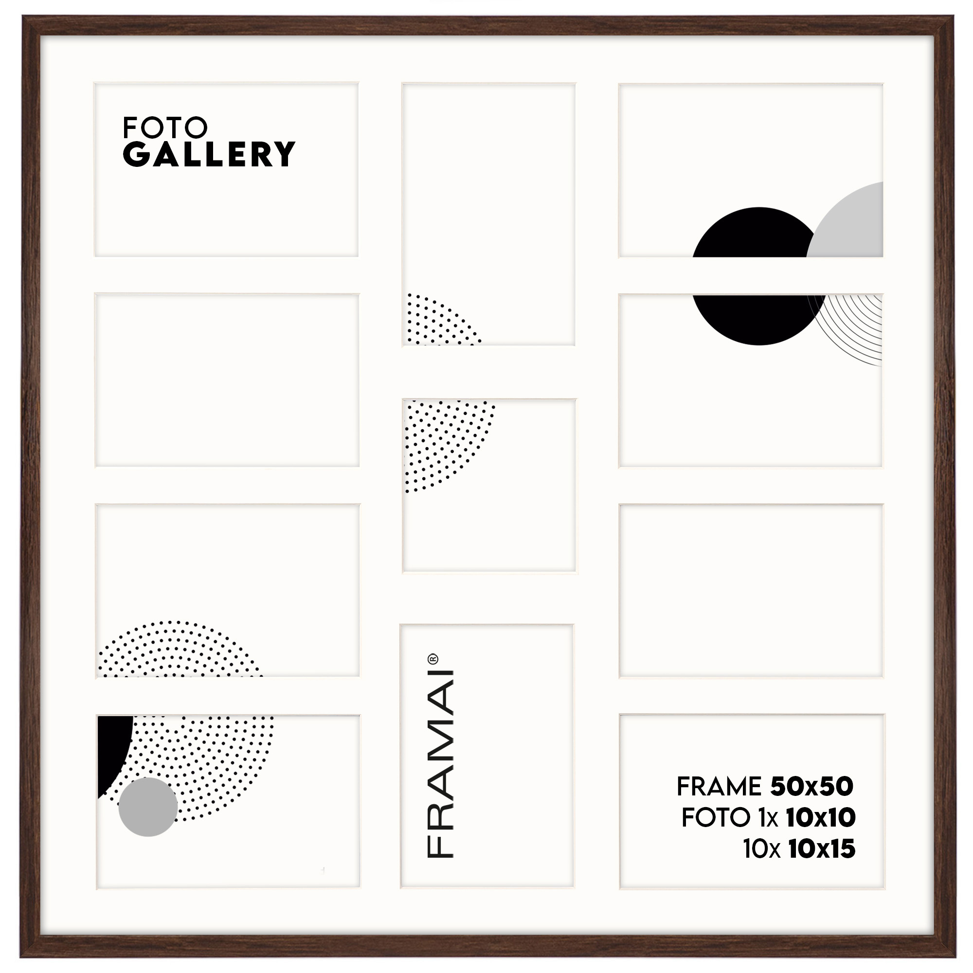 Foto Galeria na 11 zdjęć - FG-M6 50x50 cm (wymiar ramy wewnętrzny) odpowiednia do oprawy jedenastu zdjęć o formatach 10x15 cm i 10x10 cm. Kolor ramki brązowy