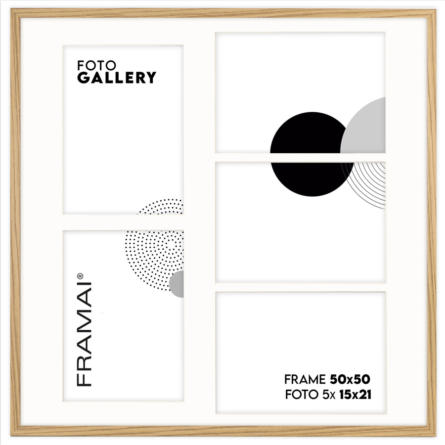 Foto Galeria na 5 zdjęć - FG-M02 50x50 cm (wymiar ramy wewnętrzny) odpowiednia do oprawy pięciu zdjęć o formacie 15x21 cm. Kolor ramki dębowy
