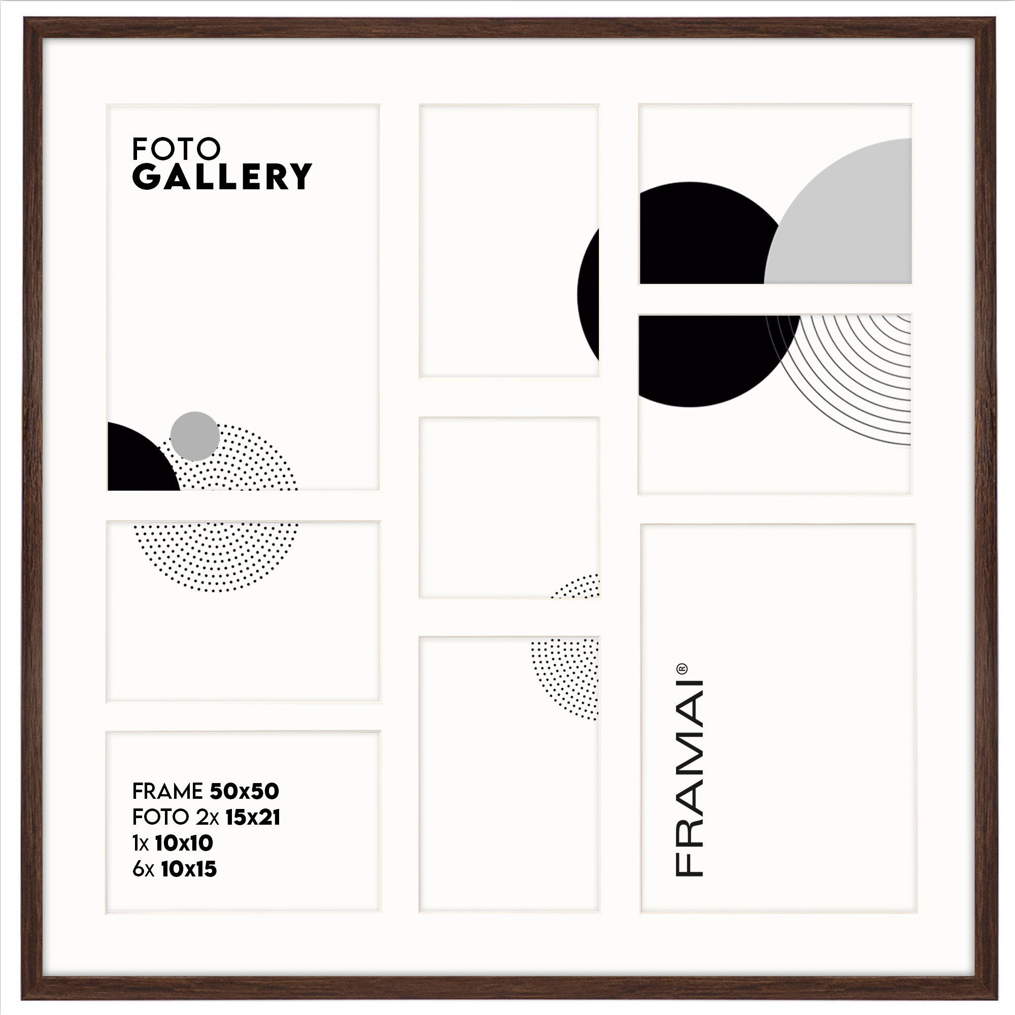 Foto Galeria na 9 zdjęć - FG-M6 50x50 cm (wymiar ramy wewnętrzny) odpowiednia do oprawy dziewięciu zdjęć o formatach 10x15, 15x21 i 10x10 cm. Kolor ramki brązowy