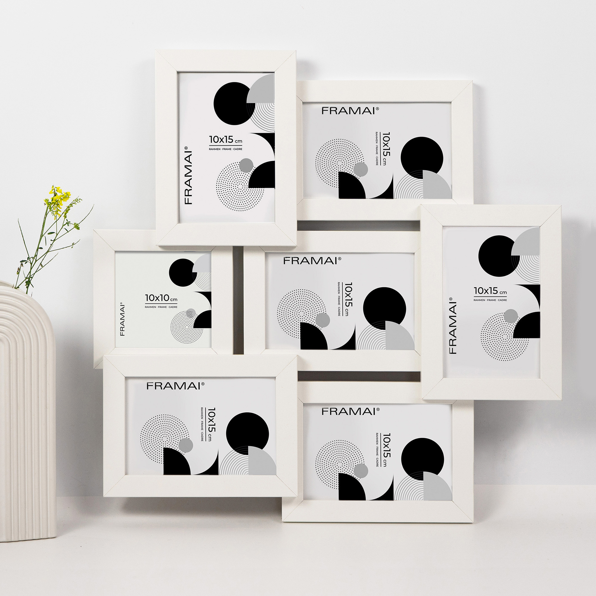 Multirama HEN 1 to elegancka oprawa na 7 zdjęć – sześć o wymiarach 10x15 cm i jedno o wymiarach 10x10 cm. Wykonana z MDF z prostym, matowym wykończeniem w klasycznym białym kolorze, stanowi idealną propozycję do stworzenia stylowej galerii rodzinnej lub wyeksponowania wyjątkowych wspomnień z wakacji. Każda multirama jest wykonana w 100% z ekologicznego MDF, wyposażona w bezbarwne plexi organiczne oraz twarde plecy z płyty HDF, co zapewnia trwałość i stabilność konstrukcji.