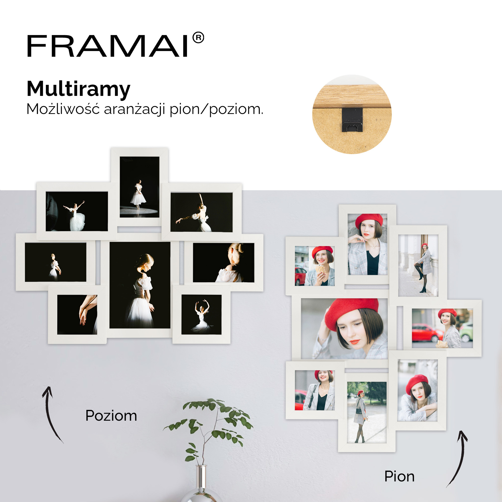 Ramki w multiramie mają estetycznie wykończone narożniki i są trwale skręcone stalowymi wkrętami. Dzięki elastycznym blaszkom, wymiana fotografii jest szybka i łatwa – to świetna zabawa dla całej rodziny. Praktyczna zawieszka pozwala na zawieszenie multiramy w pionie lub poziomie, dopasowując ją do każdej aranżacji wnętrza. Każda ramka jest indywidualnie pakowana w ochronne tekturowe opakowanie oraz folię, co gwarantuje jej bezpieczny transport i idealny stan przy odbiorze.