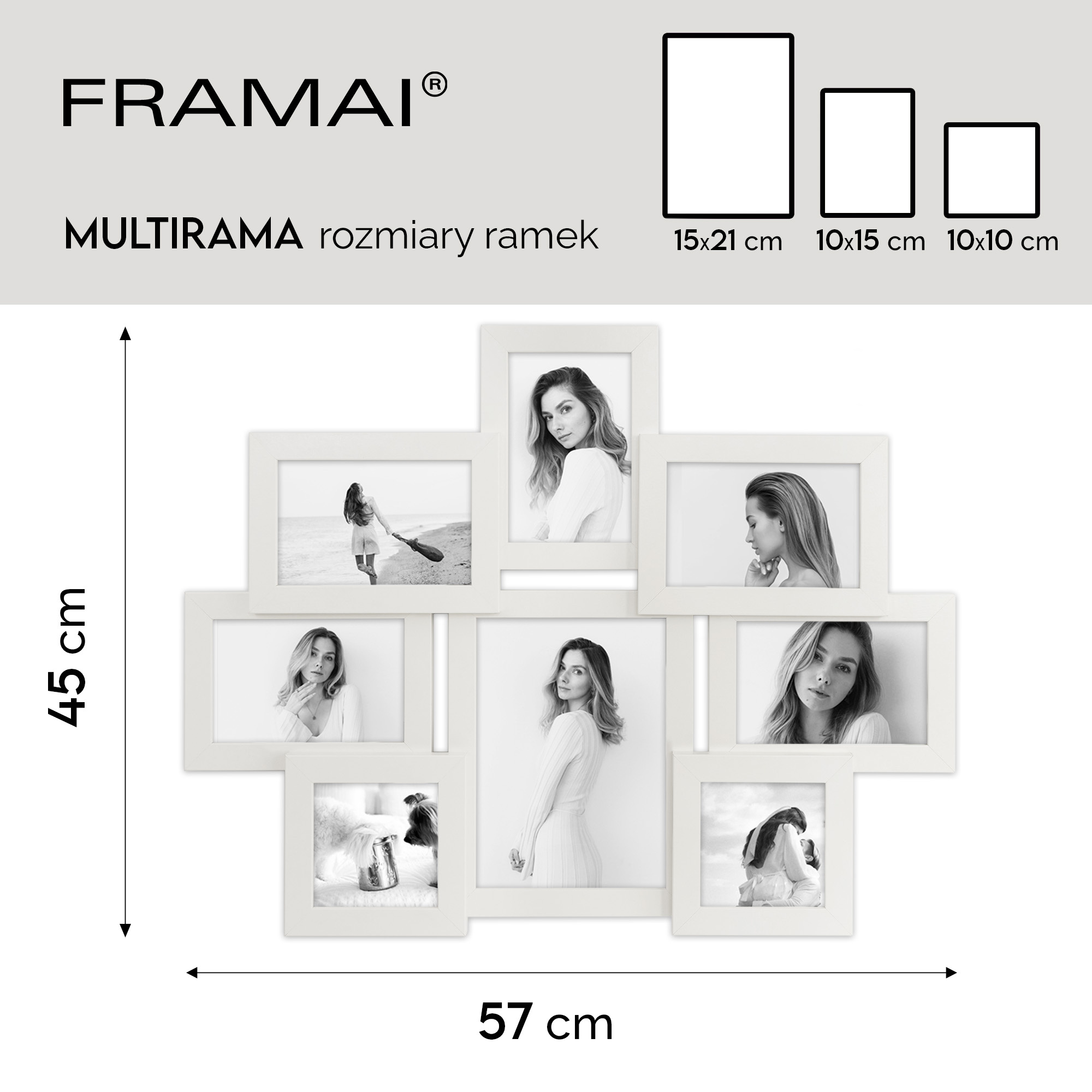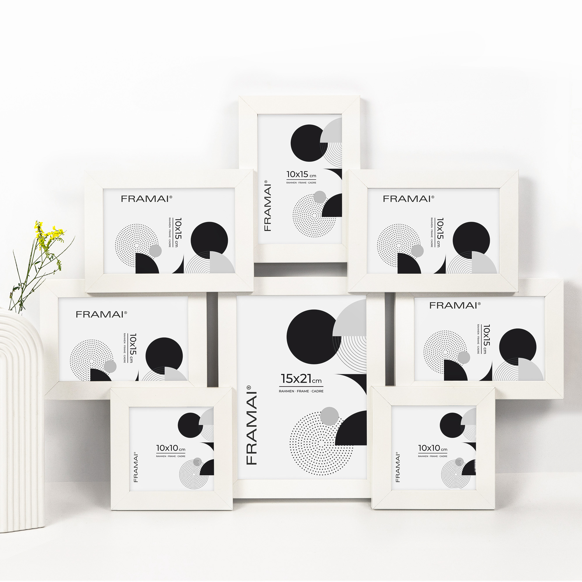 Multirama HEN 1 to elegancka oprawa na 8 zdjęć – pięć o wymiarach 10x15 cm, dwa o wymiarach 10x10 cm i jedno o wymiarach 15x21 cm. Wykonana z MDF z prostym, matowym wykończeniem w eleganckim białym kolorze, stanowi idealną propozycję do stworzenia stylowej galerii rodzinnej lub wyeksponowania wyjątkowych wspomnień z wakacji. Każda multirama jest wykonana w 100% z ekologicznego MDF, wyposażona w bezbarwne plexi organiczne oraz twarde plecy z płyty HDF, co zapewnia trwałość i stabilność konstrukcji.