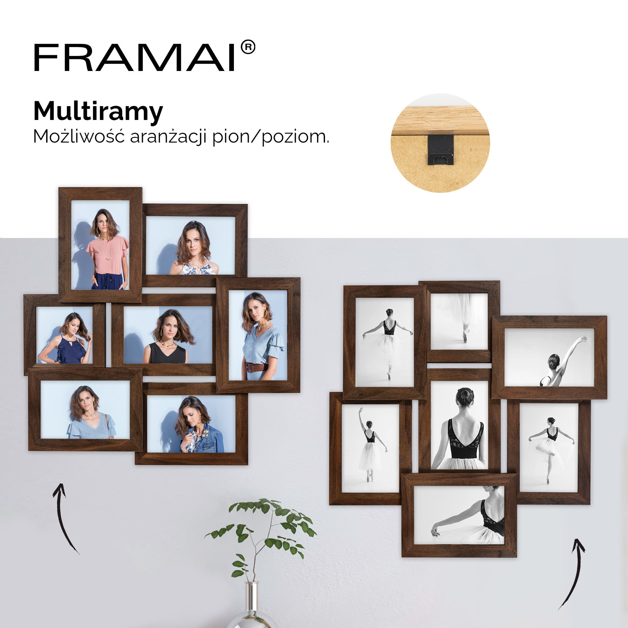 Ramki w multiramie mają estetycznie wykończone narożniki i są trwale skręcone stalowymi wkrętami. Dzięki elastycznym blaszkom, wymiana fotografii jest szybka i łatwa – to świetna zabawa dla całej rodziny. Praktyczna zawieszka pozwala na zawieszenie multiramy w pionie lub poziomie, dopasowując ją do każdej aranżacji wnętrza. Każda ramka jest indywidualnie pakowana w ochronne tekturowe opakowanie oraz folię, co gwarantuje jej bezpieczny transport i idealny stan przy odbiorze.