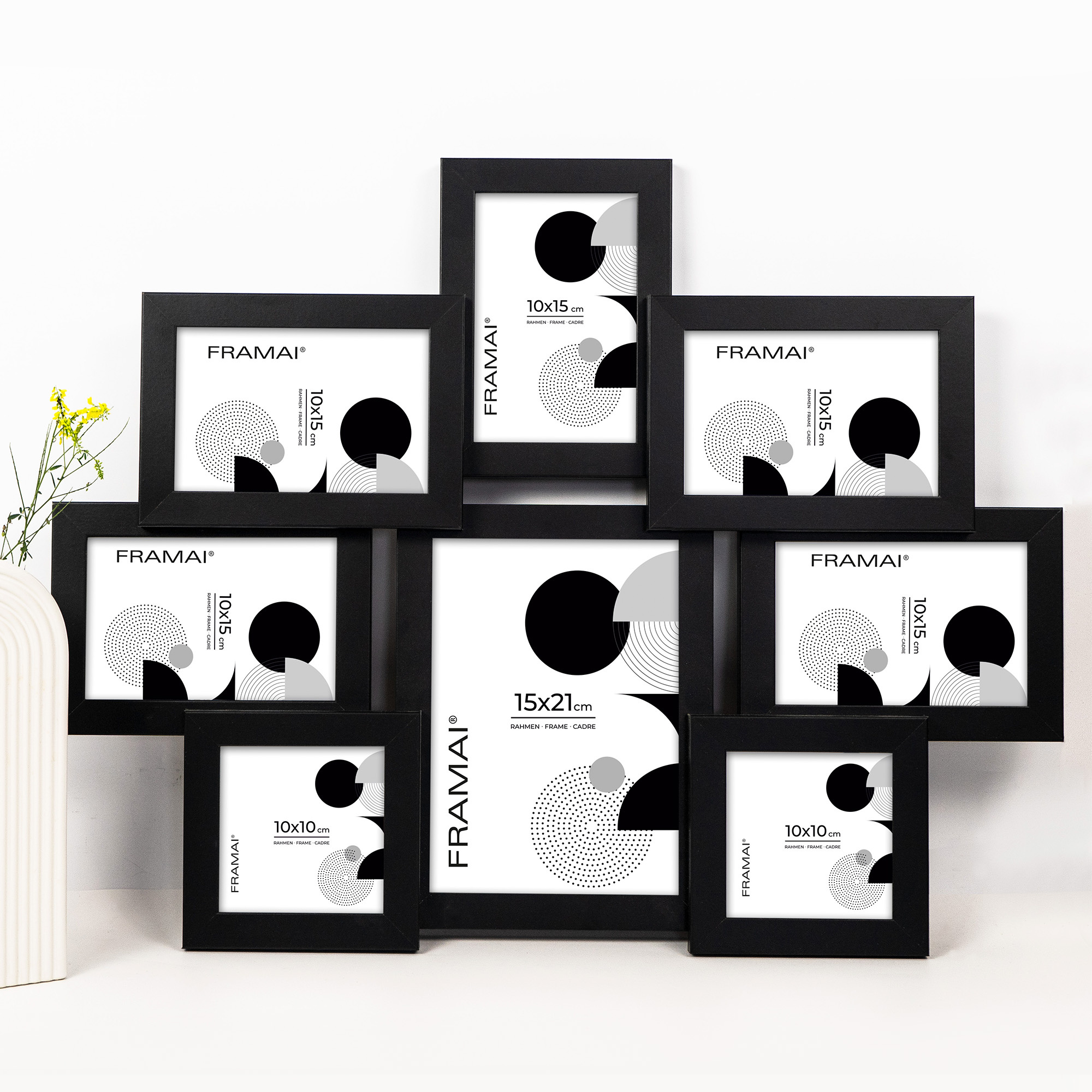 Multirama HEN 2 to elegancka oprawa na 8 zdjęć – pięć o wymiarach 10x15 cm, dwa o wymiarach 10x10 cm i jedno o wymiarach 15x21 cm. Wykonana z MDF z prostym, matowym wykończeniem w eleganckim czarnym kolorze, stanowi idealną propozycję do stworzenia stylowej galerii rodzinnej lub wyeksponowania wyjątkowych wspomnień z wakacji. Każda multirama jest wykonana w 100% z ekologicznego MDF, wyposażona w bezbarwne plexi organiczne oraz twarde plecy z płyty HDF, co zapewnia trwałość i stabilność konstrukcji.