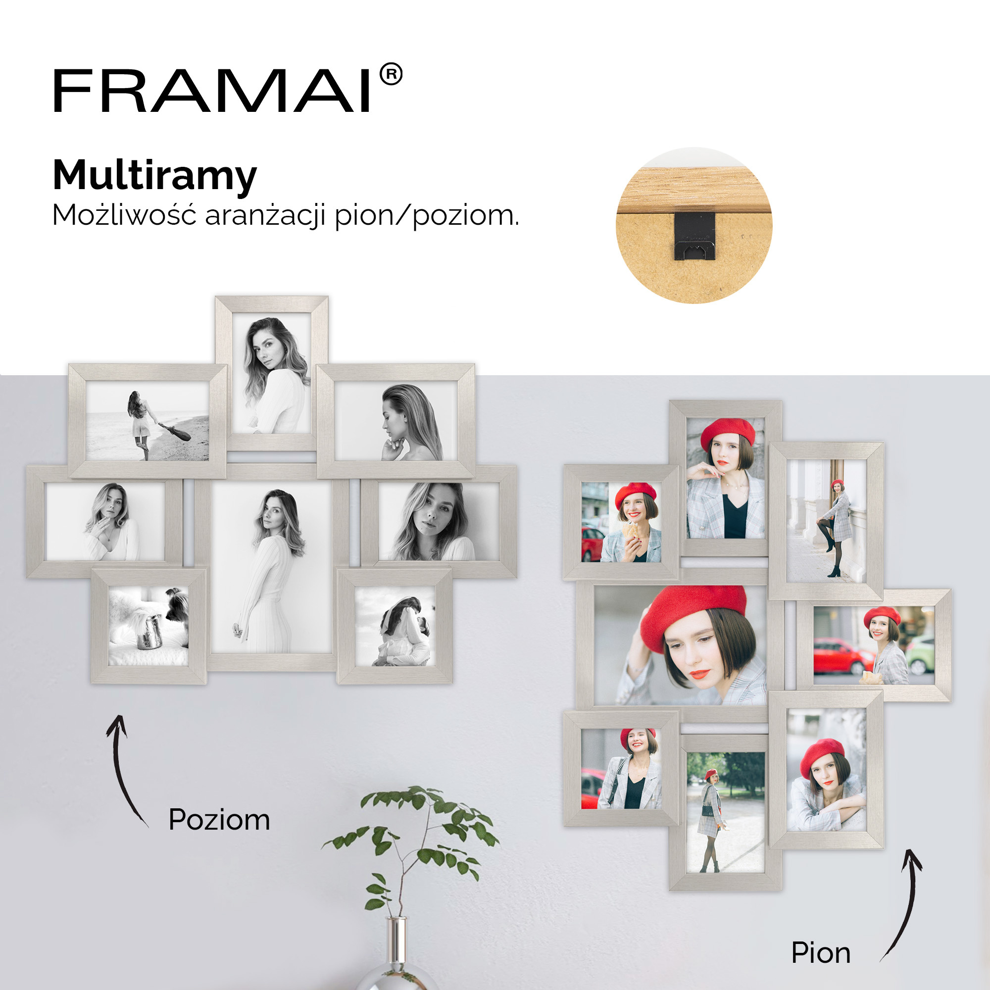 Ramki w multiramie mają estetycznie wykończone narożniki i są trwale skręcone stalowymi wkrętami. Dzięki elastycznym blaszkom, wymiana fotografii jest szybka i łatwa – to świetna zabawa dla całej rodziny. Praktyczna zawieszka pozwala na zawieszenie multiramy w pionie lub poziomie, dopasowując ją do każdej aranżacji wnętrza. Każda ramka jest indywidualnie pakowana w ochronne tekturowe opakowanie oraz folię, co gwarantuje jej bezpieczny transport i idealny stan przy odbiorze.