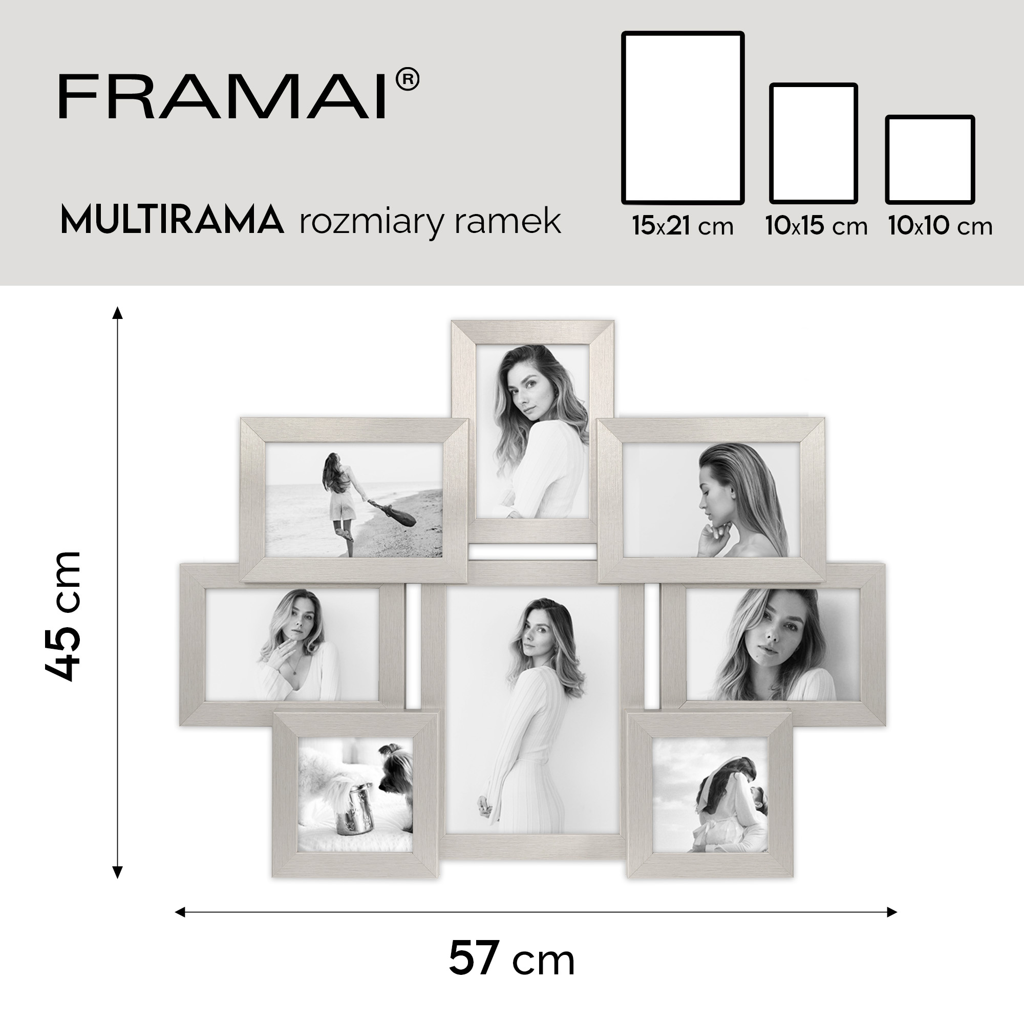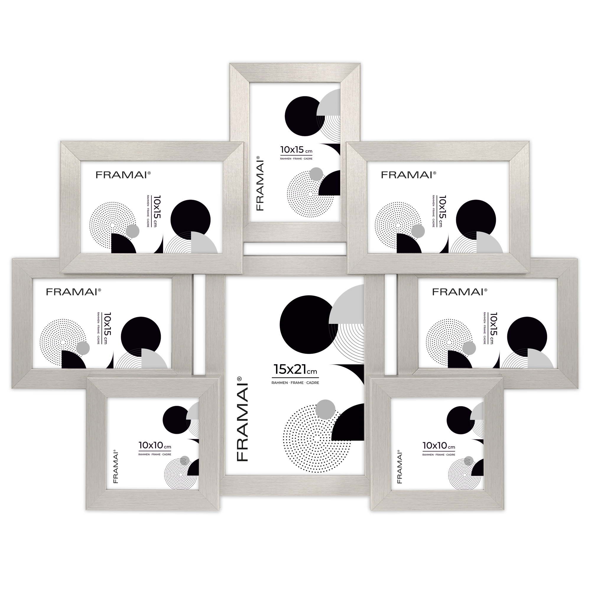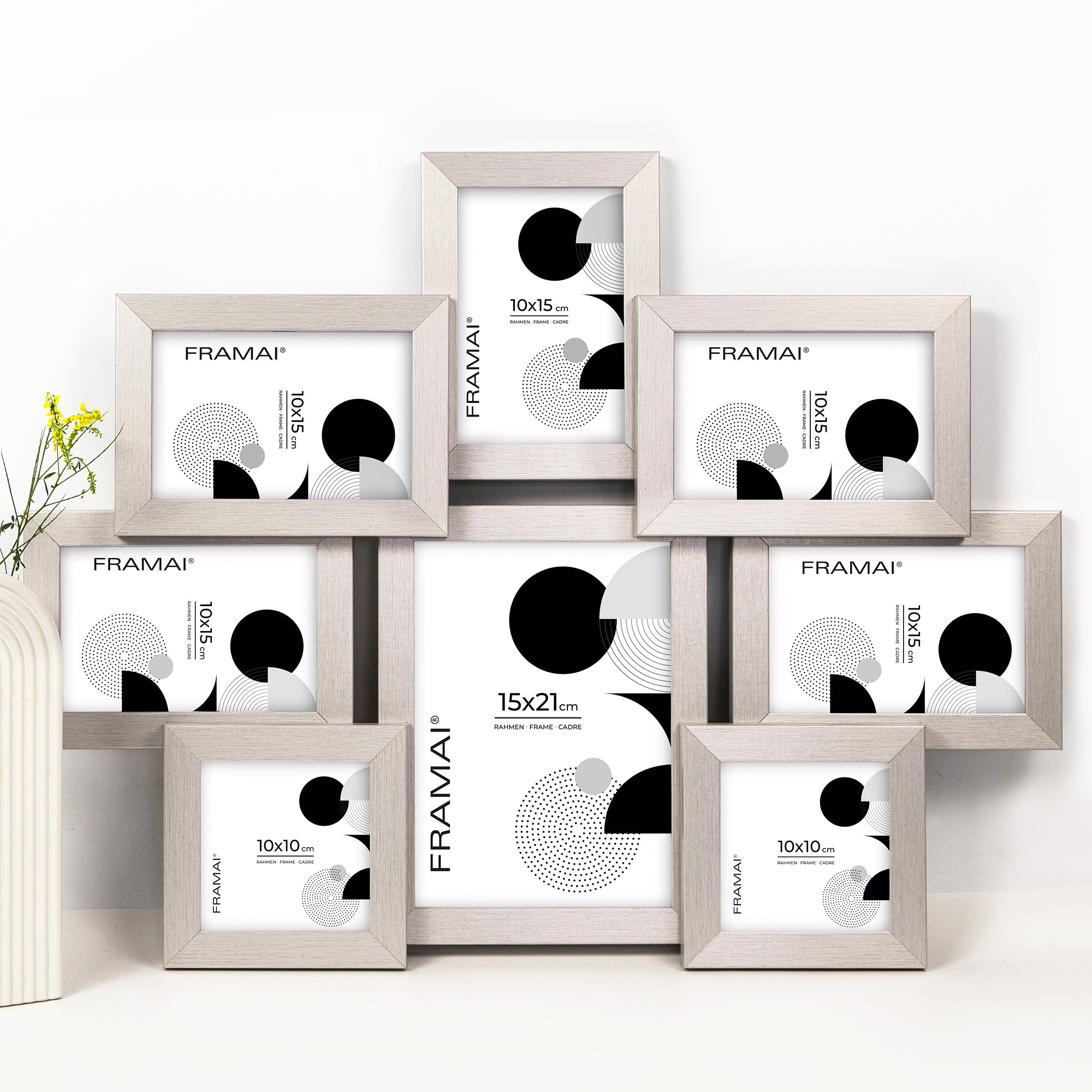 Multirama HEN S to elegancka oprawa na 8 zdjęć – pięć o wymiarach 10x15 cm, dwa o wymiarach 10x10 cm i jedno o wymiarach 15x21 cm. Wykonana z MDF z prostym, satynowym wykończeniem w eleganckim srebrnym kolorze, stanowi idealną propozycję do stworzenia stylowej galerii rodzinnej lub wyeksponowania wyjątkowych wspomnień z wakacji. Każda multirama jest wykonana w 100% z ekologicznego MDF, wyposażona w bezbarwne plexi organiczne oraz twarde plecy z płyty HDF, co zapewnia trwałość i stabilność konstrukcji.