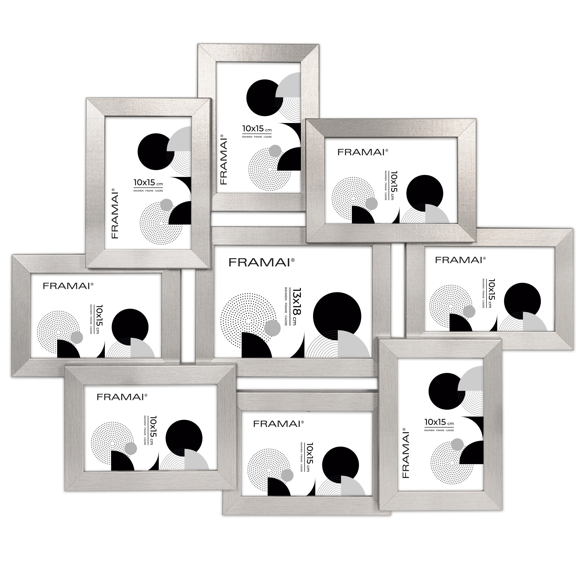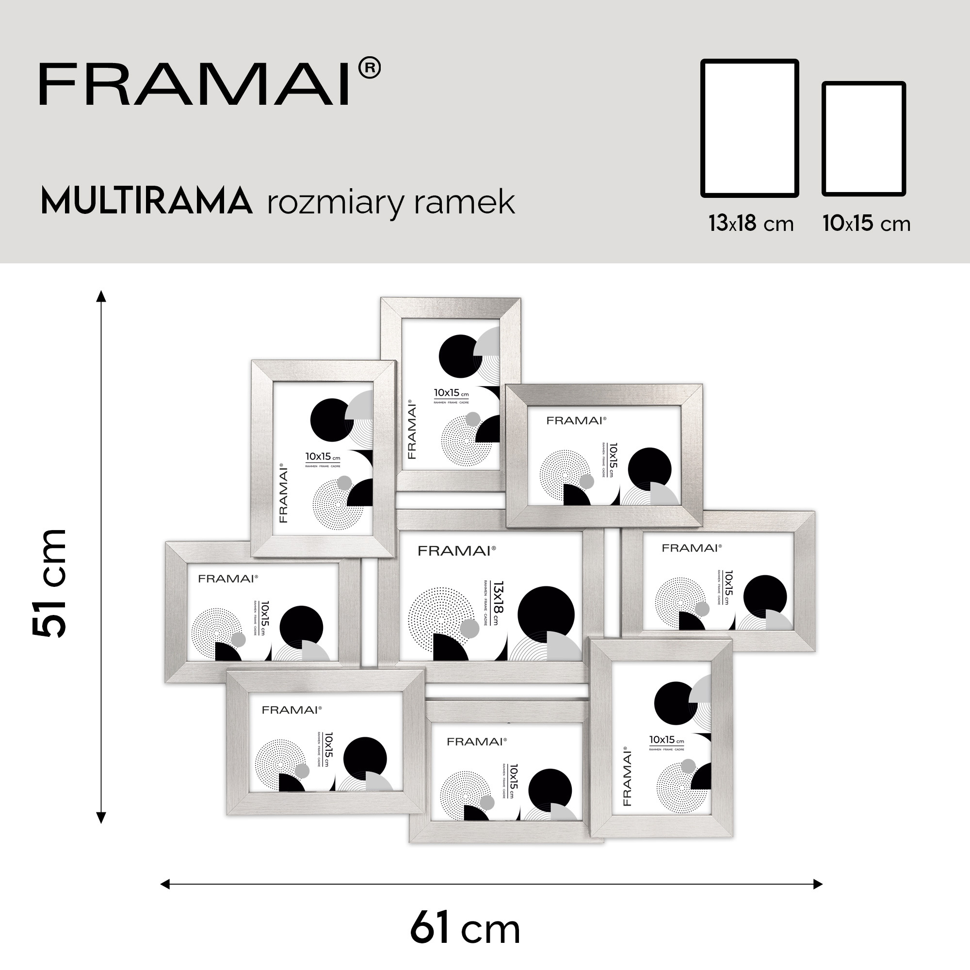 Multirama HEN S to elegancka oprawa na 9 zdjęć – osiem o wymiarach 10x15 cm i jedno o wymiarach 13x18 cm. Wykonana z MDF z prostym, satynowym wykończeniem w eleganckim srebrnym kolorze, stanowi idealną propozycję do stworzenia stylowej galerii rodzinnej lub wyeksponowania wyjątkowych wspomnień z wakacji. Każda multirama jest wykonana w 100% z ekologicznego MDF, wyposażona w bezbarwne plexi organiczne oraz twarde plecy z płyty HDF, co zapewnia trwałość i stabilność konstrukcji.