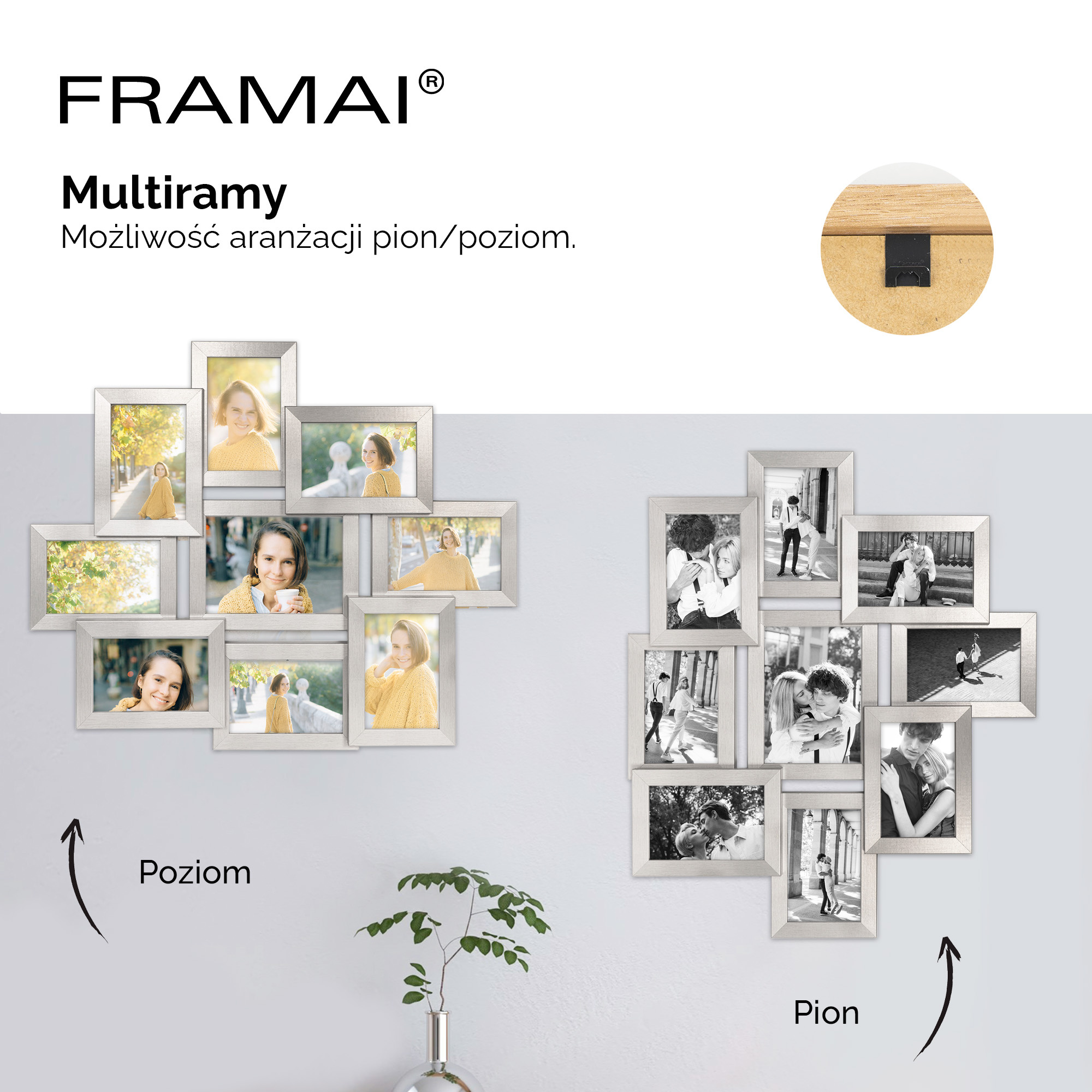 Ramki w multiramie mają estetycznie wykończone narożniki i są trwale skręcone stalowymi wkrętami. Dzięki elastycznym blaszkom, wymiana fotografii jest szybka i łatwa – to świetna zabawa dla całej rodziny. Praktyczna zawieszka pozwala na zawieszenie multiramy w pionie lub poziomie, dopasowując ją do każdej aranżacji wnętrza. Każda ramka jest indywidualnie pakowana w ochronne tekturowe opakowanie oraz folię, co gwarantuje jej bezpieczny transport i idealny stan przy odbiorze.