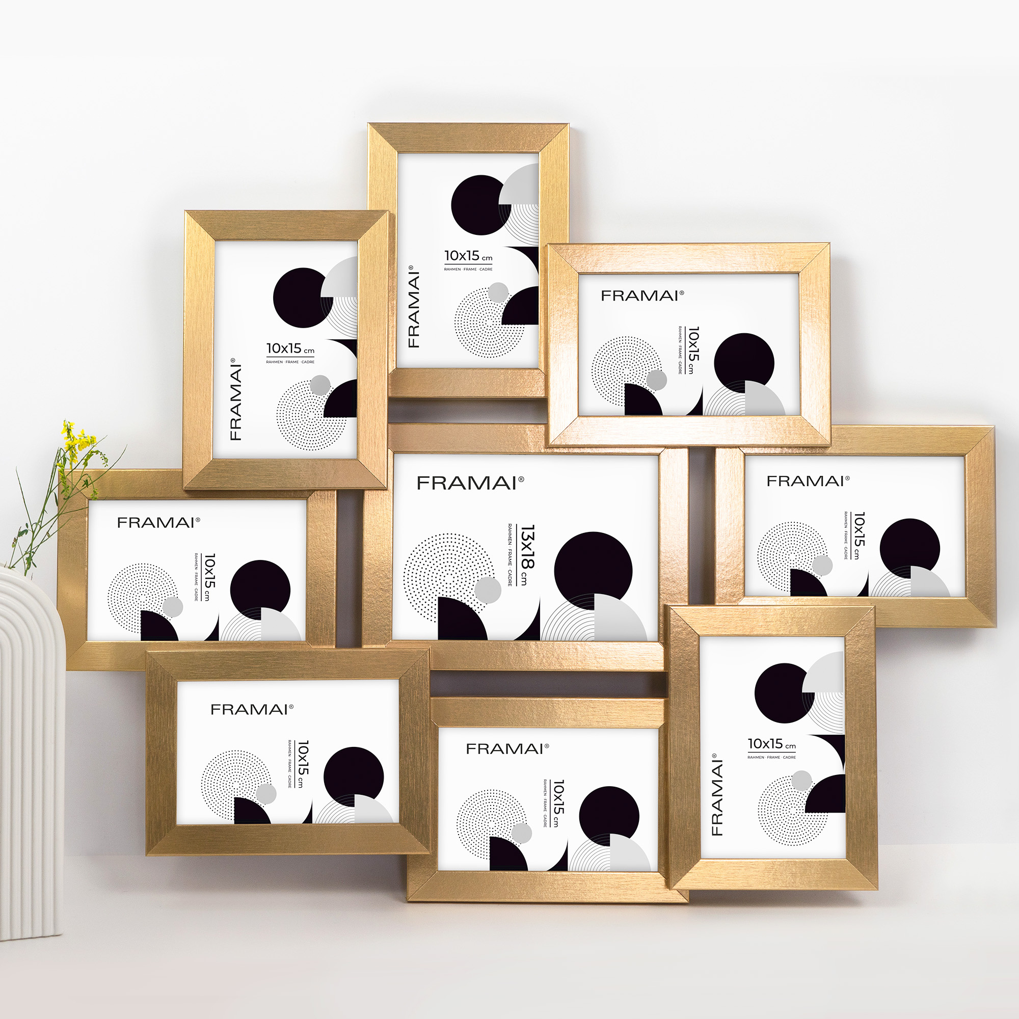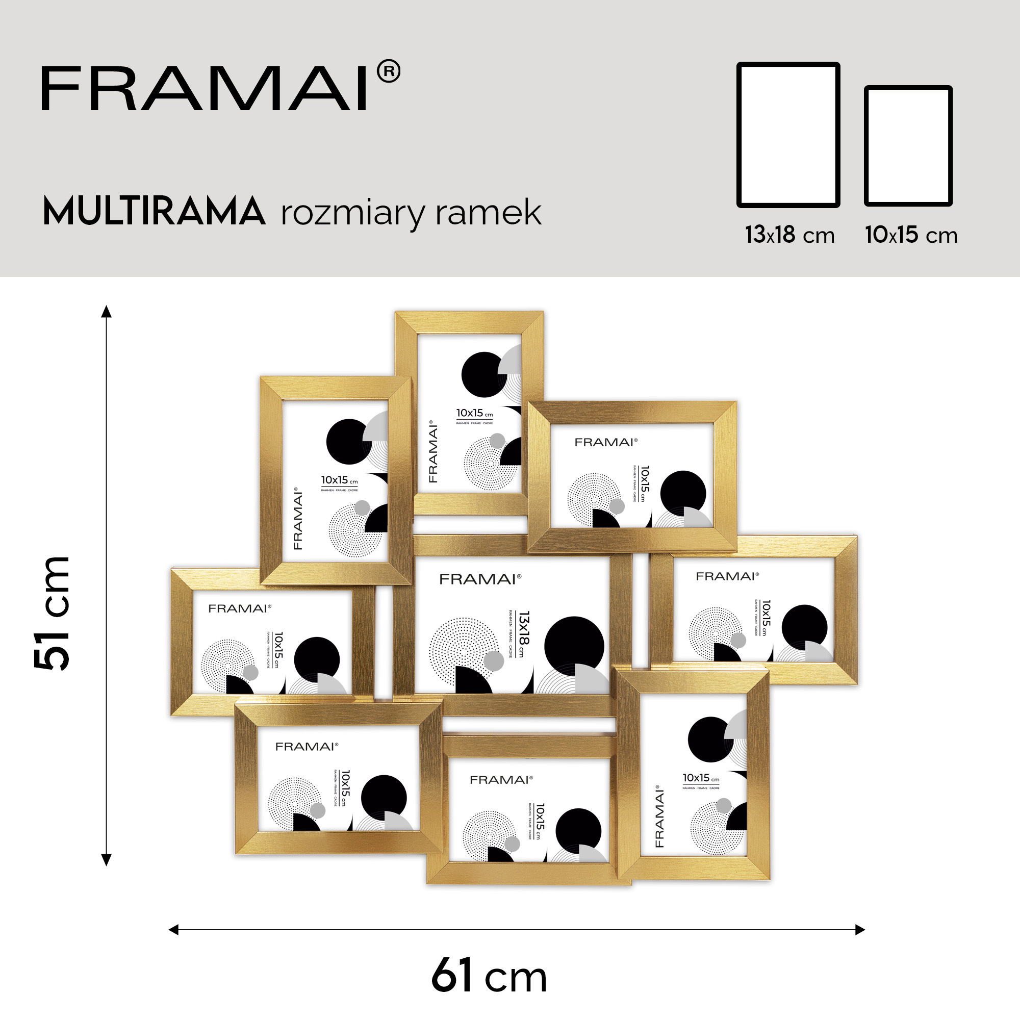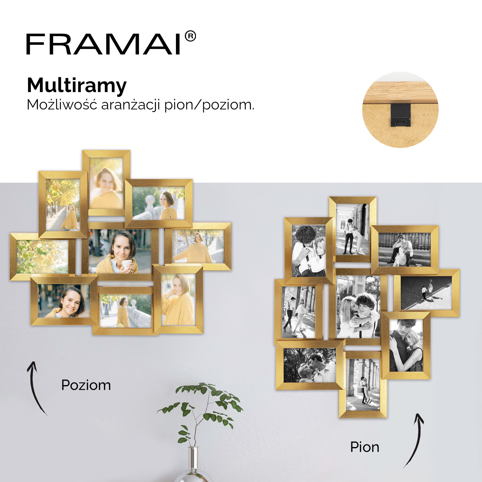 Multirama HEN Z to elegancka oprawa na 9 zdjęć – osiem o wymiarach 10x15 cm i jedno o wymiarach 13x18 cm. Wykonana z MDF z prostym, satynowym wykończeniem w eleganckim złotym kolorze, stanowi idealną propozycję do stworzenia stylowej galerii rodzinnej lub wyeksponowania wyjątkowych wspomnień z wakacji. Każda multirama jest wykonana w 100% z ekologicznego MDF, wyposażona w bezbarwne plexi organiczne oraz twarde plecy z płyty HDF, co zapewnia trwałość i stabilność konstrukcji.