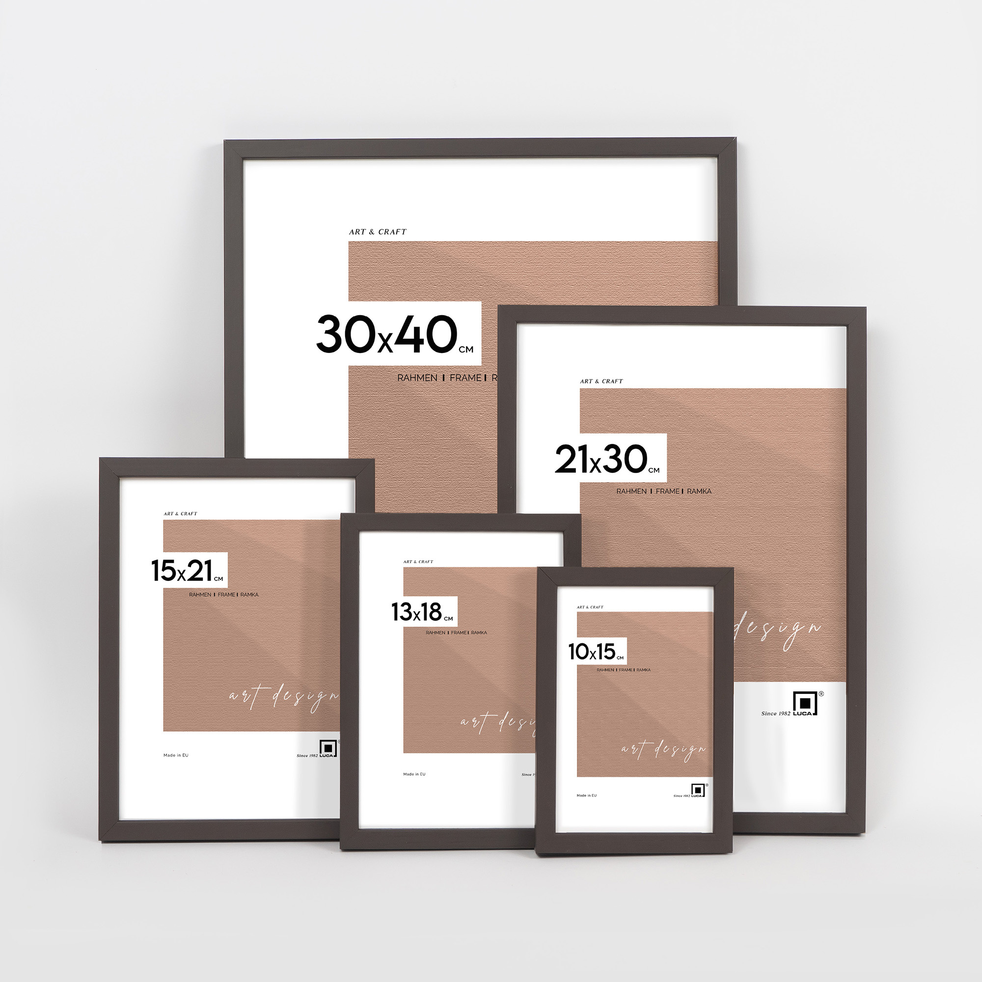 Fotoramki w kolorze czekoladowym o przekroju profilu 11x14 mm wykonane w 100% z drewna. Pakiet ramek drewnianych jest doskonałą propozycją do ekonomicznej oprawy zdjęć, rysunków, druków. Ramki pakowane są w zestawie po 5 szt. Wyposażone są w szkło mineralne. Plecki wykonane są z twardej płyty HDF. Ramki na zdjęcia do rozmiaru 18x24 cm dodatkowo posiadają stopkę / nóżkę która pozwala eksponować oprawiony obraz na biurku lub regale. Pakiet ramek drewnianych PINIA 02 PAK dostępny jest w rozmiarach od 10x15 cm do 30x40 cm.