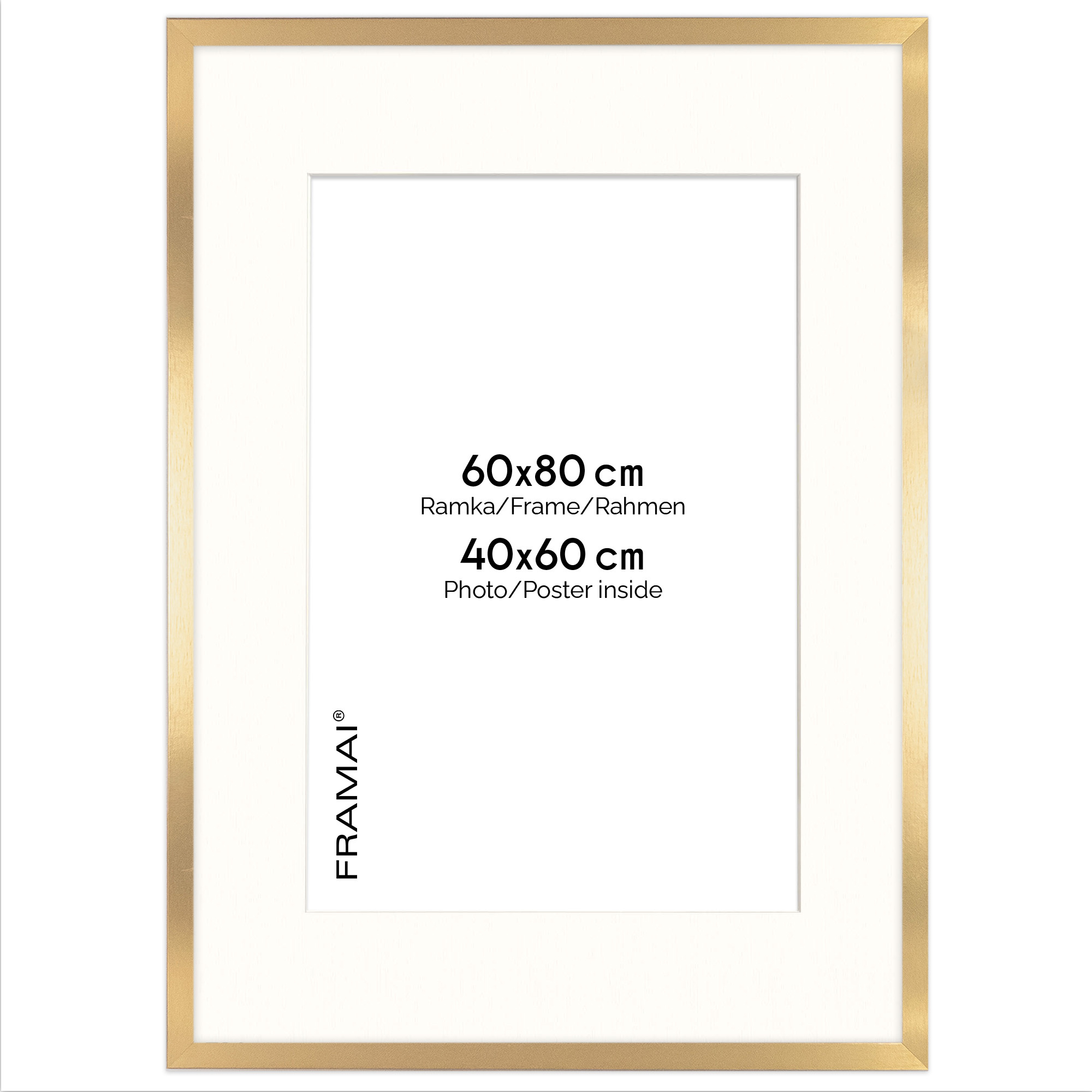 Ramka 60×80 cm w złotym kolorze z passe-partout przeznaczonym na zdjęcia 40×60 cm.