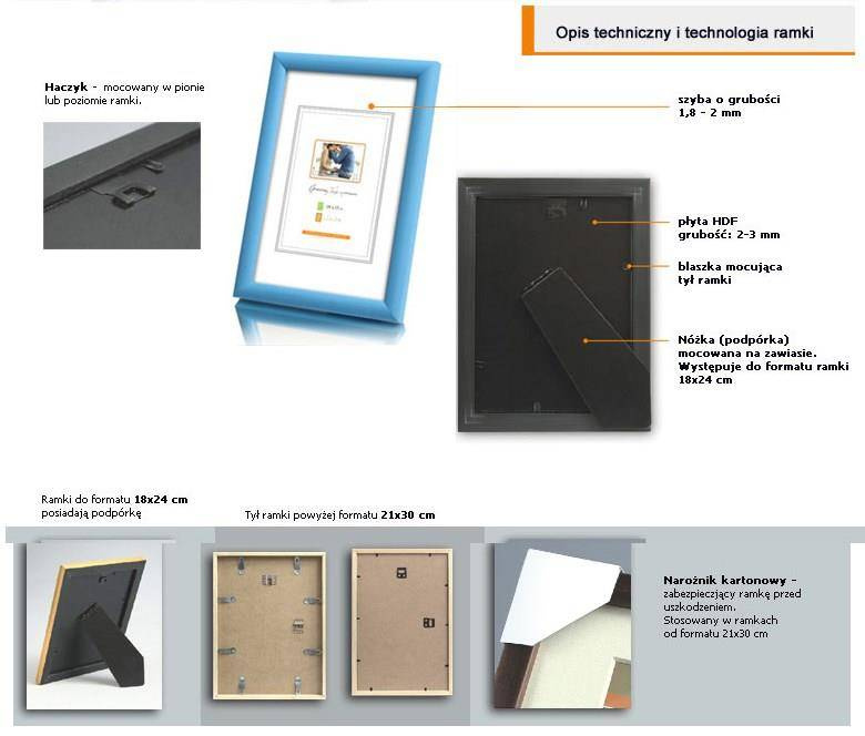 - Ramka z podpórką: stopka występuje do formatu 18x24 cm umożliwia postawienie w pionie lub poziomie