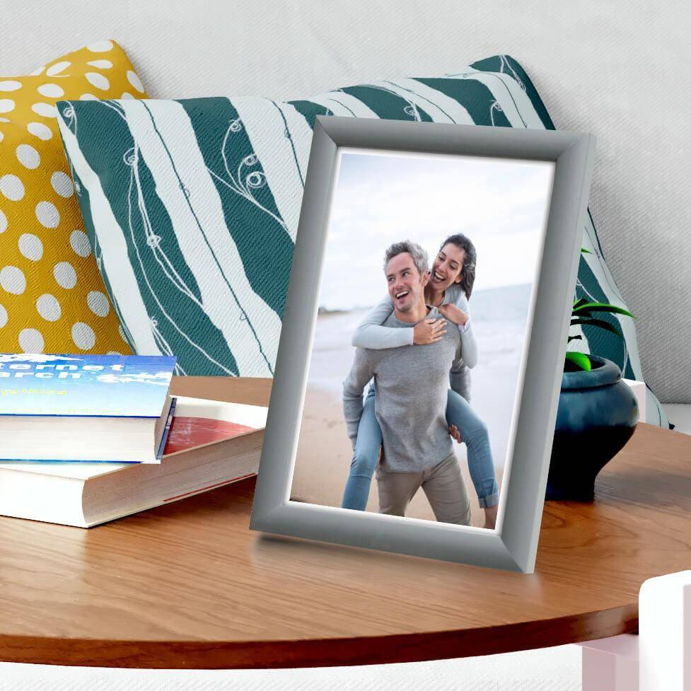 Nowoczesna fotoramka w szarym kolorze o przekroju profilu 13x12 mm wykonana w 100% z drewna. Przeznaczona jest do oprawy fotografii, plakatów i dyplomów. W zależności od formatu wyposażona jest w szkło mineralne lub bezbarwne szkło organiczne - wysokiej jakości plexi. Plecki wykonane są z twardej płyty HDF. Ramki na zdjęcia do rozmiaru 18x24 cm dodatkowo posiadają stopkę / nóżkę która pozwala eksponować oprawiony obraz na biurku lub regale. Ramka drewniana TITI dostępna jest w rozmiarach od 10x15 cm do 40x50 cm.