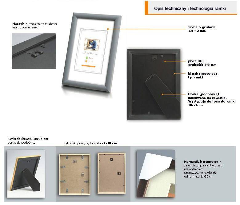 - Ramka z podpórką: stopka występuje do formatu 18x24 cm umożliwia postawienie w pionie lub poziomie