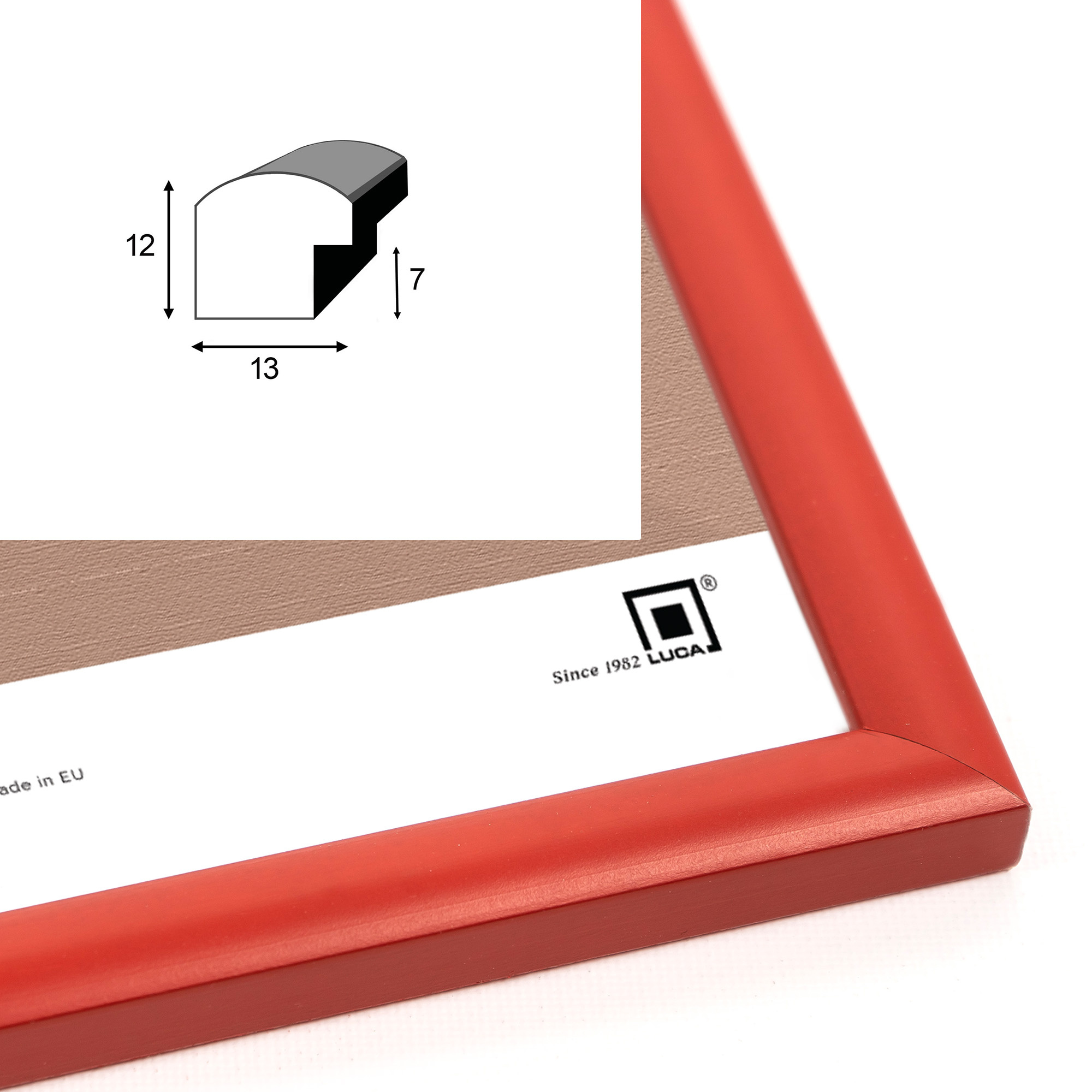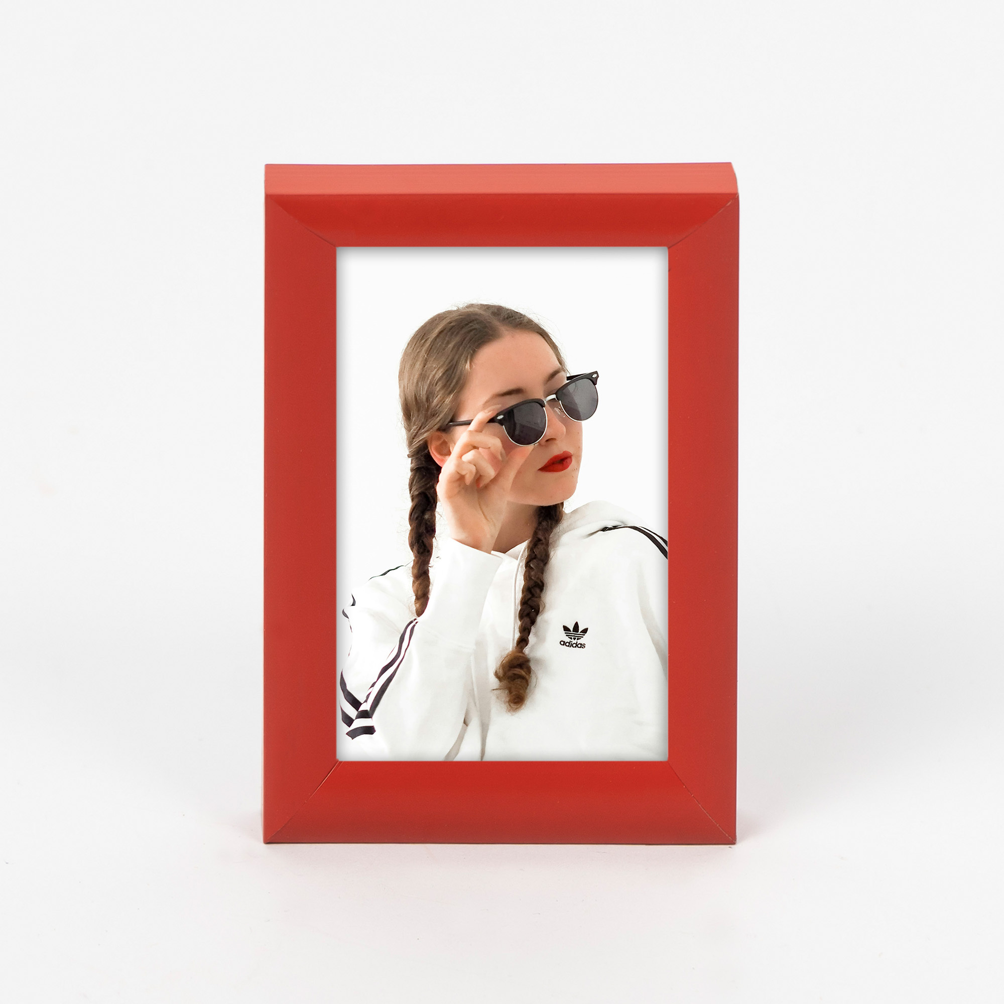 Nowoczesna fotoramka w czerwonym kolorze o przekroju profilu 13x12 mm wykonana w 100% z drewna. Przeznaczona jest do oprawy fotografii, plakatów i dyplomów. W zależności od formatu wyposażona jest w szkło mineralne lub bezbarwne szkło organiczne - wysokiej jakości plexi. Plecki wykonane są z twardej płyty HDF. Ramki na zdjęcia do rozmiaru 18x24 cm dodatkowo posiadają stopkę / nóżkę która pozwala eksponować oprawiony obraz na biurku lub regale. Ramka drewniana TITI dostępna jest w rozmiarach od 10x15 cm do 40x50 cm.
