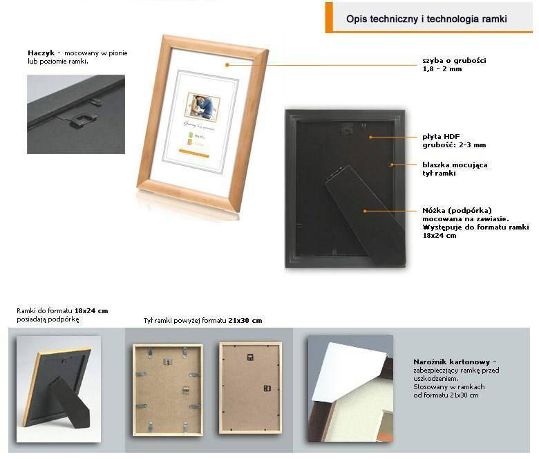 - Ramka z podpórką: stopka występuje do formatu 18x24 cm umożliwia postawienie w pionie lub poziomie
