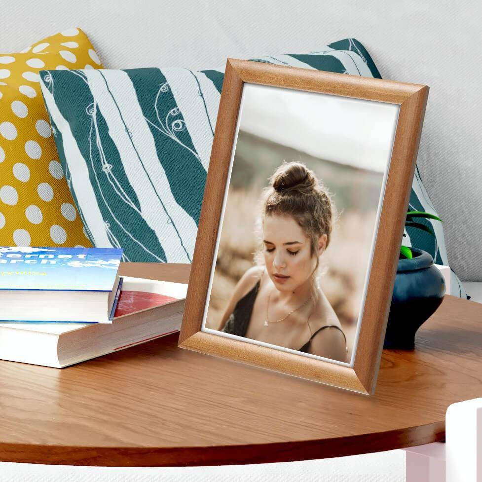 Nowoczesna fotoramka w brązowym kolorze o przekroju profilu 13x12 mm wykonana w 100% z drewna. Przeznaczona jest do oprawy fotografii, plakatów i dyplomów. W zależności od formatu wyposażona jest w szkło mineralne lub bezbarwne szkło organiczne - wysokiej jakości plexi. Plecki wykonane są z twardej płyty HDF. Ramki na zdjęcia do rozmiaru 18x24 cm dodatkowo posiadają stopkę / nóżkę która pozwala eksponować oprawiony obraz na biurku lub regale. Ramka drewniana TITI dostępna jest w rozmiarach od 10x15 cm do 40x50 cm.