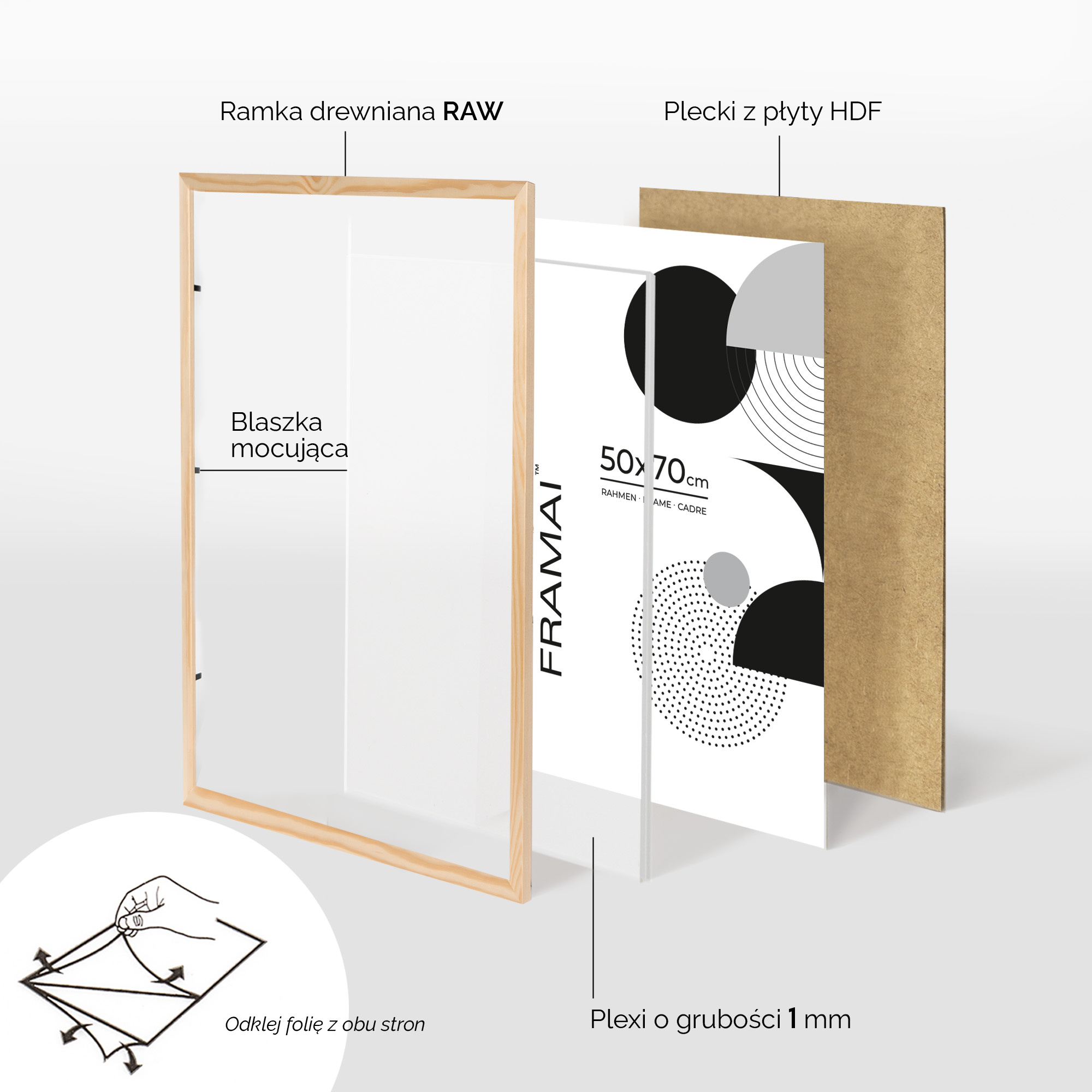- Blaszki mocujące: miękkie blaszki mocujące tył ramki, zapewniają możliwość wielokrotnego otwierania