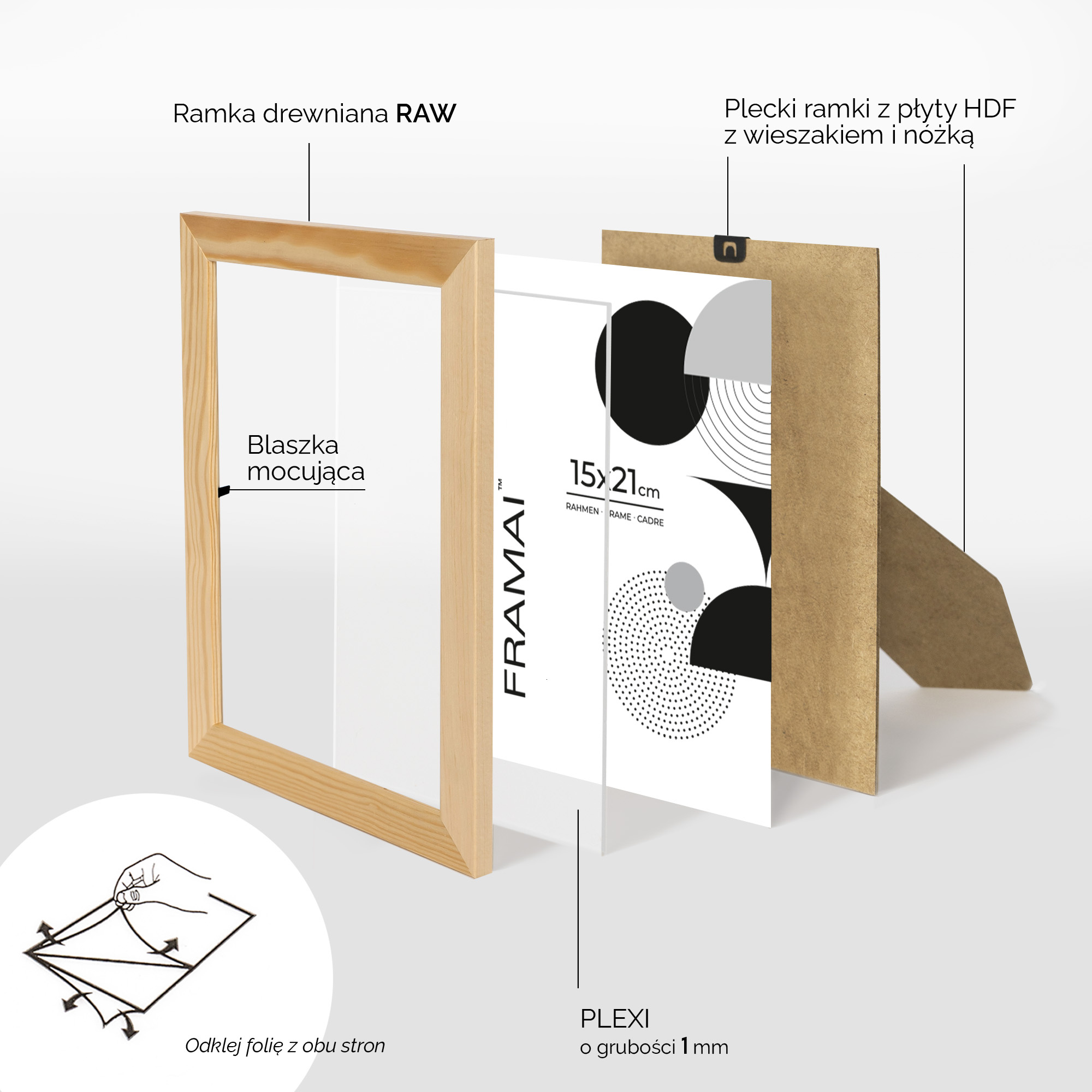 - Blaszki mocujące: miękkie blaszki mocujące tył ramki, zapewniają możliwość wielokrotnego otwierania