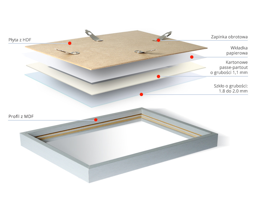 Ramka: MDF. Przód oprawy: szkło mineralne, o grubości 2 mm występuje do formatu 30x40 (włącznie) / powyżej szkło organiczne 2 mm - plexi. Tył oprawy: wykonany jest z twardej płyty HDF o grubości 3 mm. Zapinki obrotowe: mocujące tył ramki, zapewniają możliwość wielokrotnego otwierania i bardzo stabilną oprawę. Ramka z podpórką: stopka występuje do formatu 18x24 cm umożliwia postawienie w pionie lub poziomie. Wieszak: stabilna metalowa zawieszka z możliwością ekspozycji pionowo lub poziomo. Opakowanie: ramki posiadają zabezpieczające narożniki tekturowe oraz folię ochronną. Gwarancja satysfakcji: Najwyższa jakość, gatunek I. Produkt polski.