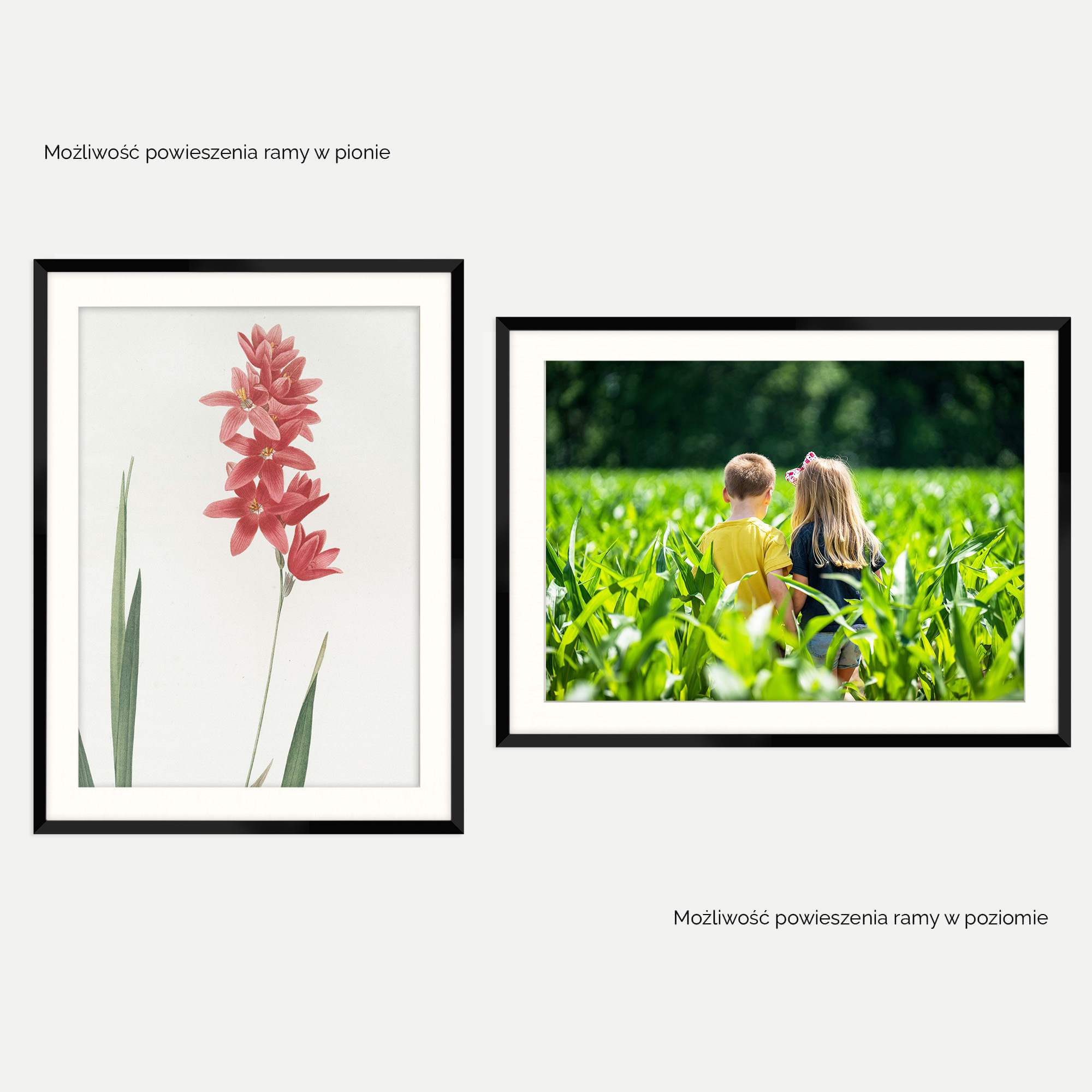 - Montaż: Możliwość zawieszenia ramki w pionie lub poziomie, dzięki metalowej zawieszce, a w mniejszych formatach także postawienia na biurku za pomocą tylnej stopki.