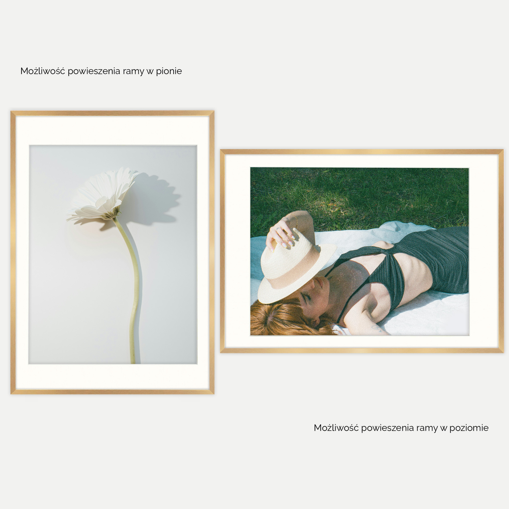 - Montaż: Możliwość zawieszenia ramki w pionie lub poziomie, dzięki metalowej zawieszce, a w mniejszych formatach także postawienia na biurku za pomocą tylnej stopki.