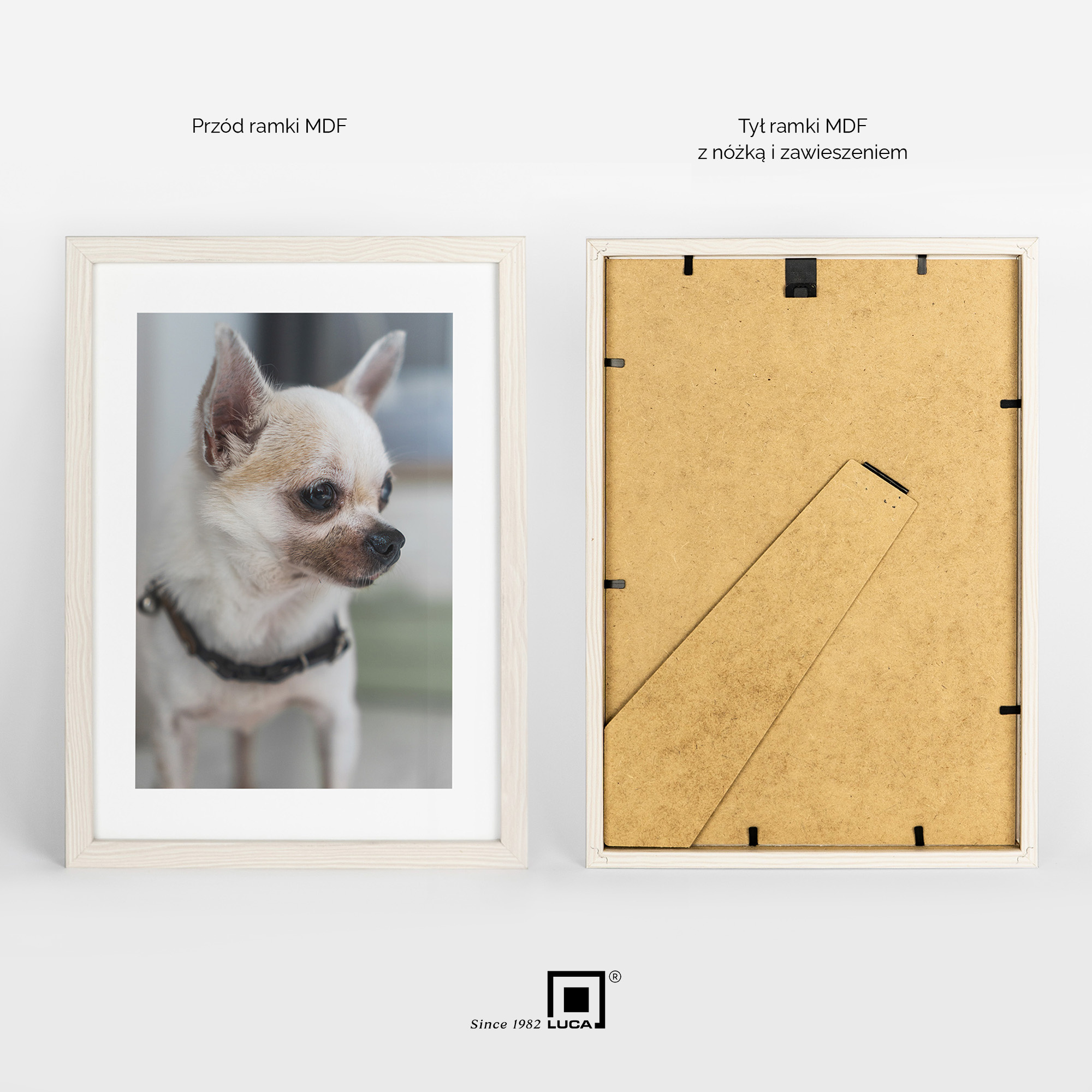 Ramka z przodu posiada grubą na 2mm plexi chroniąca zdjęcia lub grafiki przed czynnikami zewnętrznymi. Plecki ramki wykonane są z twardej płyty HDF o grubości 3 mm. Wymiar profilu to odpowiednio szerokość 13 mm i wysokość 20 mm. Ramka MDF posiada z tyłu miękkie blaszki mocujące, które pozwalają wielokrotnie otwierać i wymieniać zdjęcia.