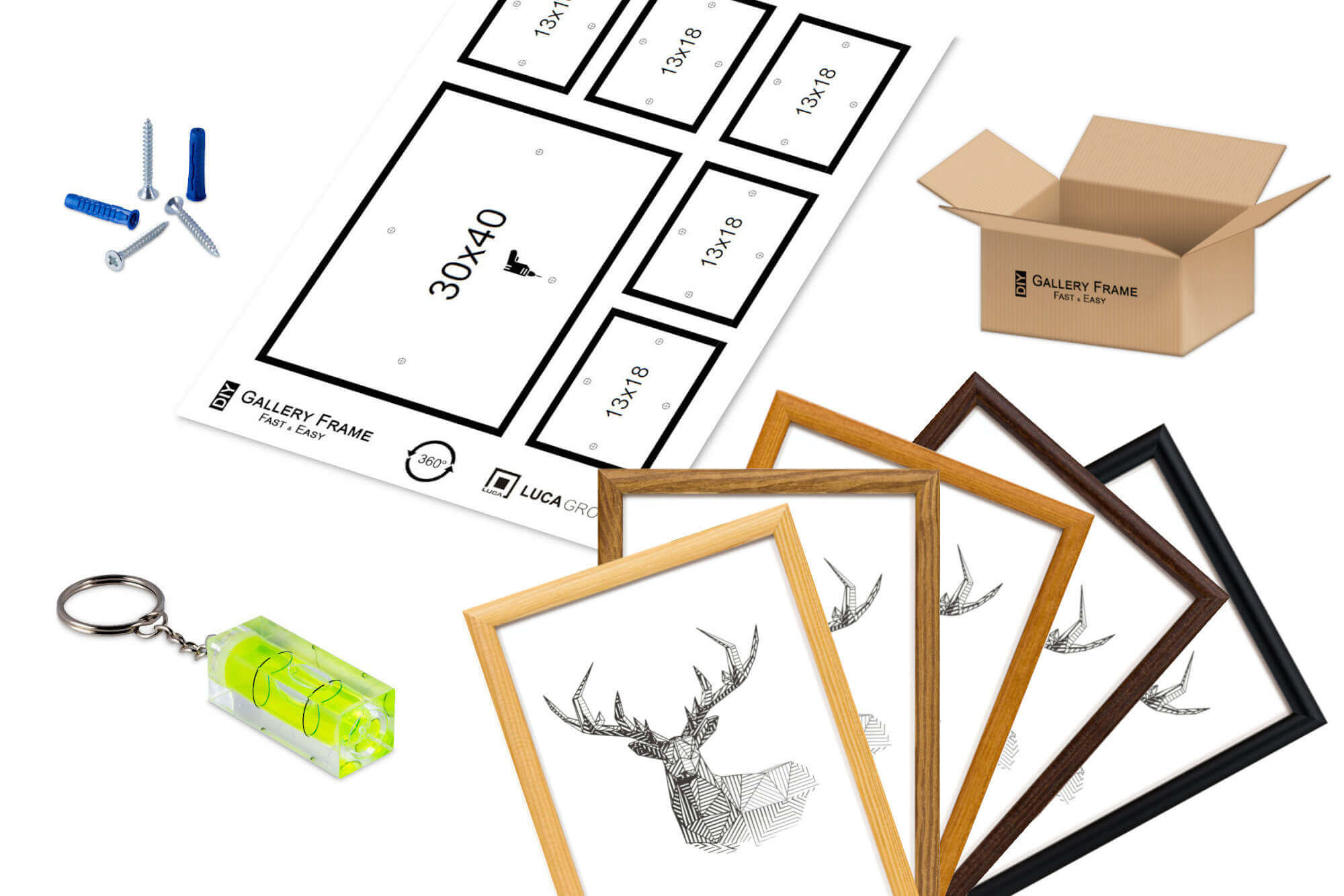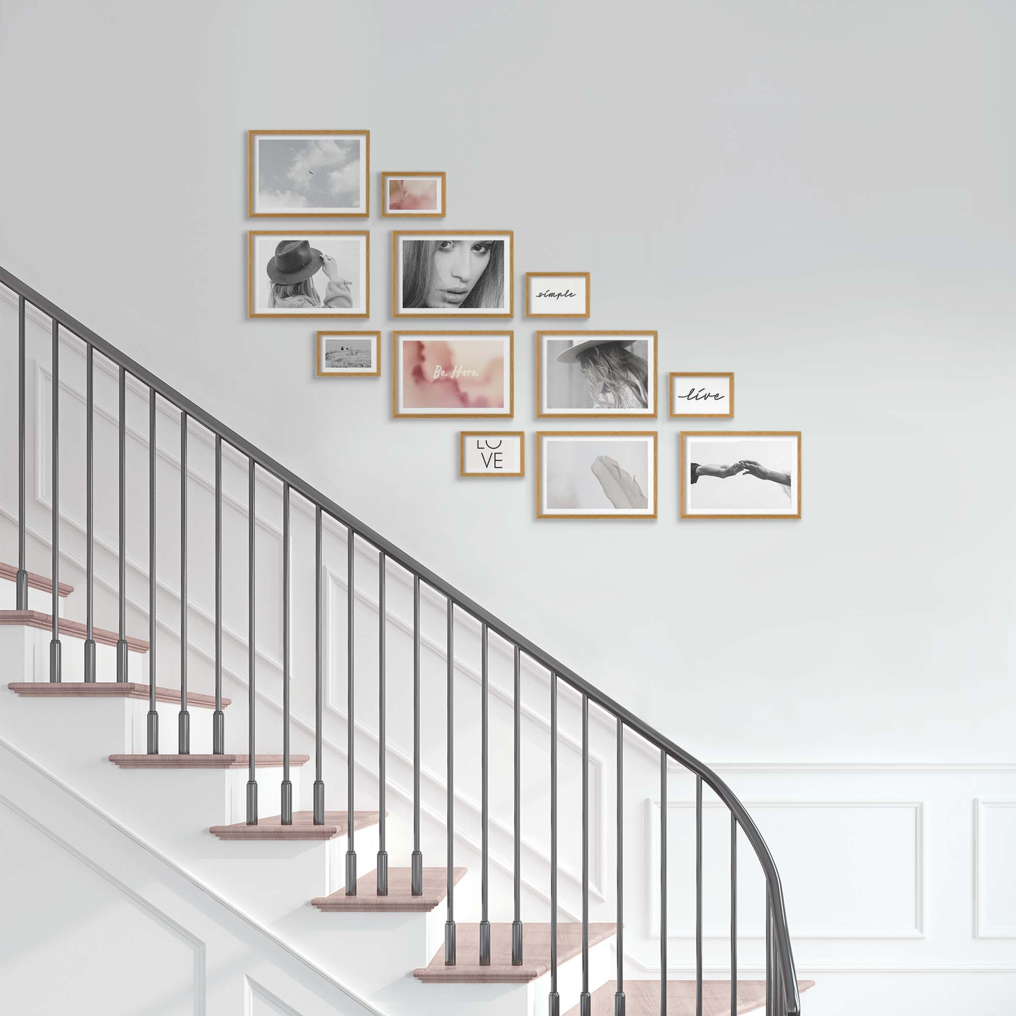 Nowoczesne galerie ścienne to prosty i efektowny sposób na aranżację ściany przy schodach. Dekoracyjny produkt pozwala stworzyć niebanalną kompozycję składającą się z 12 sztuk ramek. Wszystkie ramki zostały wykonane w 100% z drewna wysokiej jakości, dzięki czemu są trwałe i solidne. Galerie ścienne są lekkie i mają subtelny wygląd, co sprawia, że doskonale wyeksponują Twoje fotografie, grafiki oraz plakaty. Klasyczne profile o przekroju 11x14 mm sprawiają, że każda galeria ścienna będzie ponadczasowym dodatkiem do wnętrza. Warto podkreślić, że drewniane przekroje połączone zostały metodą “V-nail”, co wpływa na precyzyjne połączenie narożników.