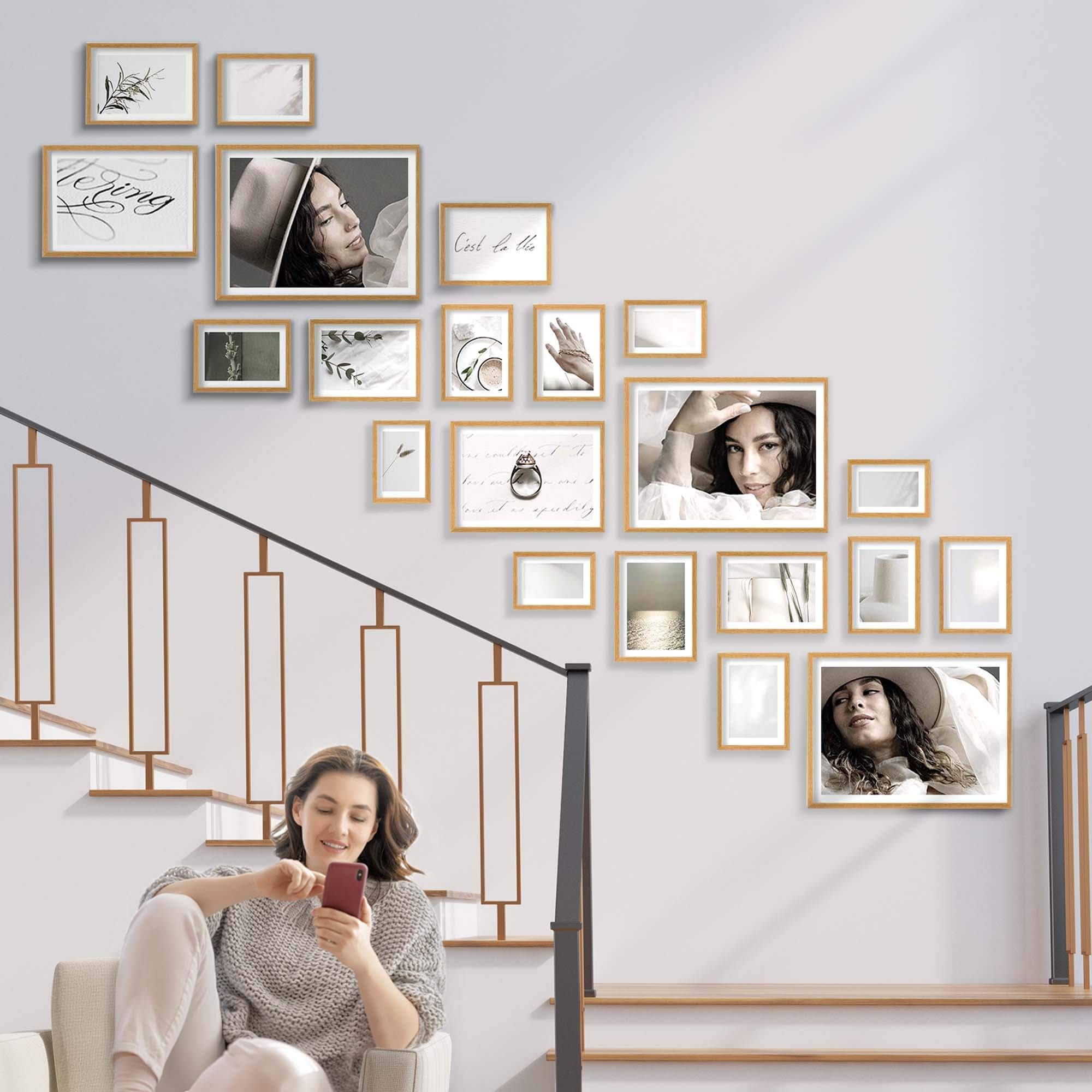 Nowoczesne galerie ścienne to prosty i efektowny sposób na aranżację ściany przy schodach. Dekoracyjny produkt pozwala stworzyć niebanalną kompozycję składającą się z 21 sztuk ramek. Wszystkie ramki zostały wykonane w 100% z drewna wysokiej jakości, dzięki czemu są trwałe i solidne. Galerie ścienne są lekkie i mają subtelny wygląd, co sprawia, że doskonale wyeksponują Twoje fotografie, grafiki oraz plakaty. Klasyczne profile o przekroju 11x14 mm sprawiają, że każda galeria ścienna będzie ponadczasowym dodatkiem do wnętrza. Warto podkreślić, że drewniane przekroje połączone zostały metodą “V-nail”, co wpływa na precyzyjne połączenie narożników.