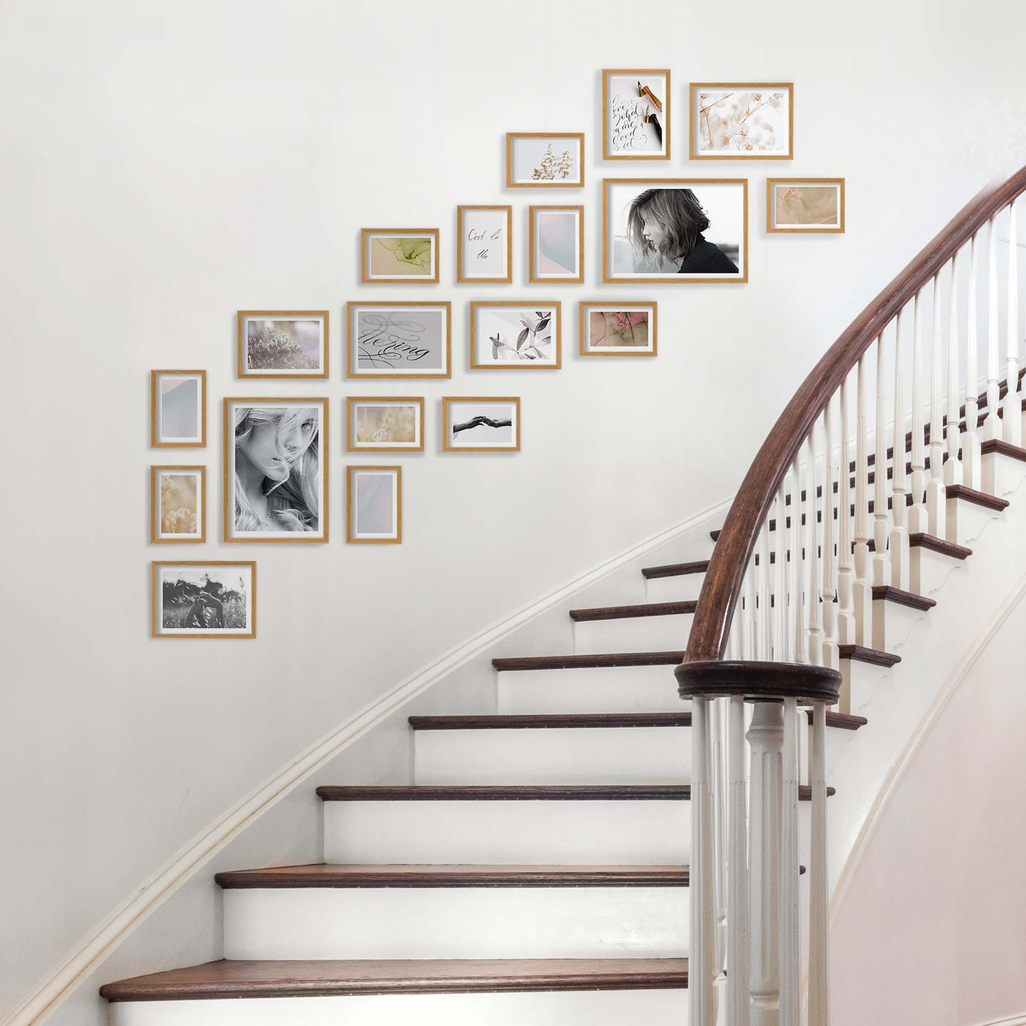 Nowoczesne galerie ścienne to prosty i efektowny sposób na aranżację ściany przy schodach. Dekoracyjny produkt pozwala stworzyć niebanalną kompozycję składającą się z 19 sztuk ramek. Wszystkie ramki zostały wykonane w 100% z drewna wysokiej jakości, dzięki czemu są trwałe i solidne. Galerie ścienne są lekkie i mają subtelny wygląd, co sprawia, że doskonale wyeksponują Twoje fotografie, grafiki oraz plakaty. Klasyczne profile o przekroju 11x14 mm sprawiają, że każda galeria ścienna będzie ponadczasowym dodatkiem do wnętrza. Warto podkreślić, że drewniane przekroje połączone zostały metodą “V-nail”, co wpływa na precyzyjne połączenie narożników.