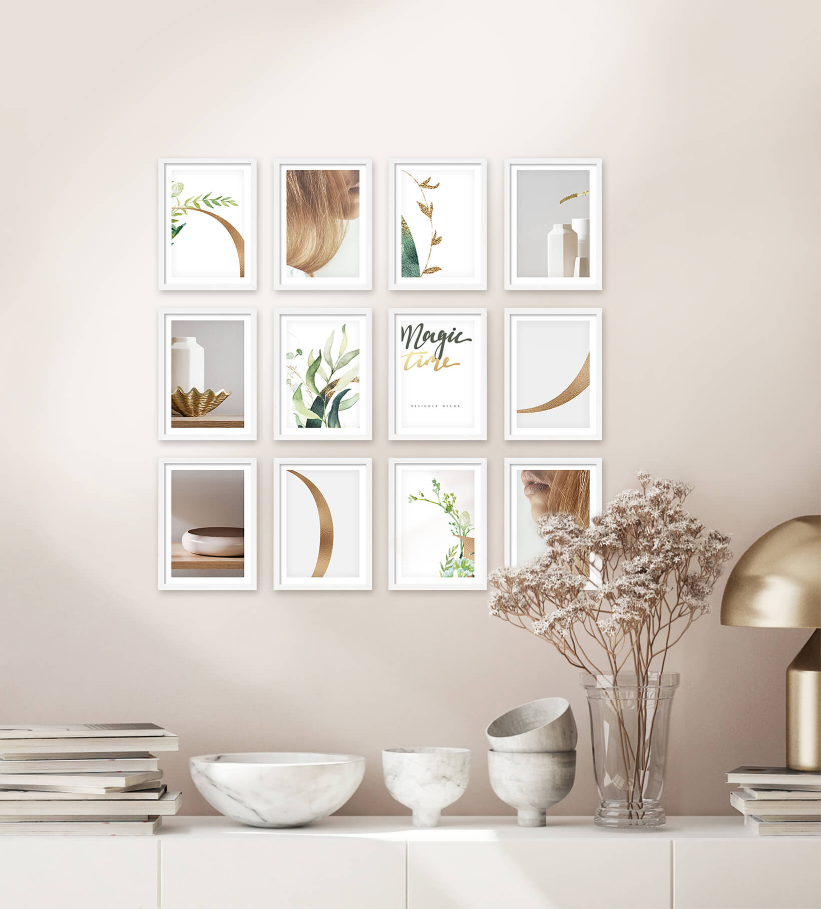 Nowoczesne galerie ścienne to prosty i efektowny sposób na aranżację każdego wnętrza. Dekoracyjny produkt pozwala stworzyć niebanalną kompozycję składającą się z 12 sztuk ramek. Wszystkie ramki zostały wykonane w 100% z drewna wysokiej jakości, dzięki czemu są trwałe i solidne. Galerie ścienne są lekkie i mają subtelny wygląd, co sprawia, że doskonale wyeksponują Twoje fotografie, grafiki oraz plakaty. Klasyczne profile o przekroju 11x14 mm sprawiają, że każda galeria ścienna będzie ponadczasowym dodatkiem do wnętrza. Warto podkreślić, że drewniane przekroje połączone zostały metodą “V-nail”, co wpływa na precyzyjne połączenie narożników.
