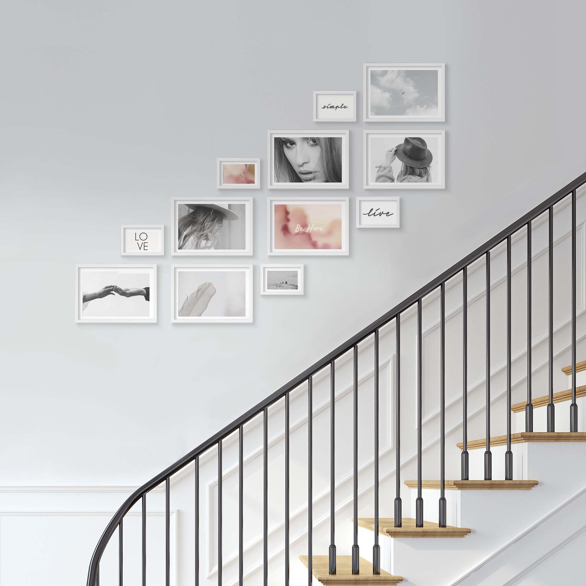 Zawieszenie kilku ramek na jednej ścianie tworzy ciekawą koncepcję, która stanowić będzie rewelacyjną ozdobę przestrzeni nad schodami. Proste ramki na zdjęcia to idealny pomysł, aby zapamiętać wyjątkowe chwile na długi czas.