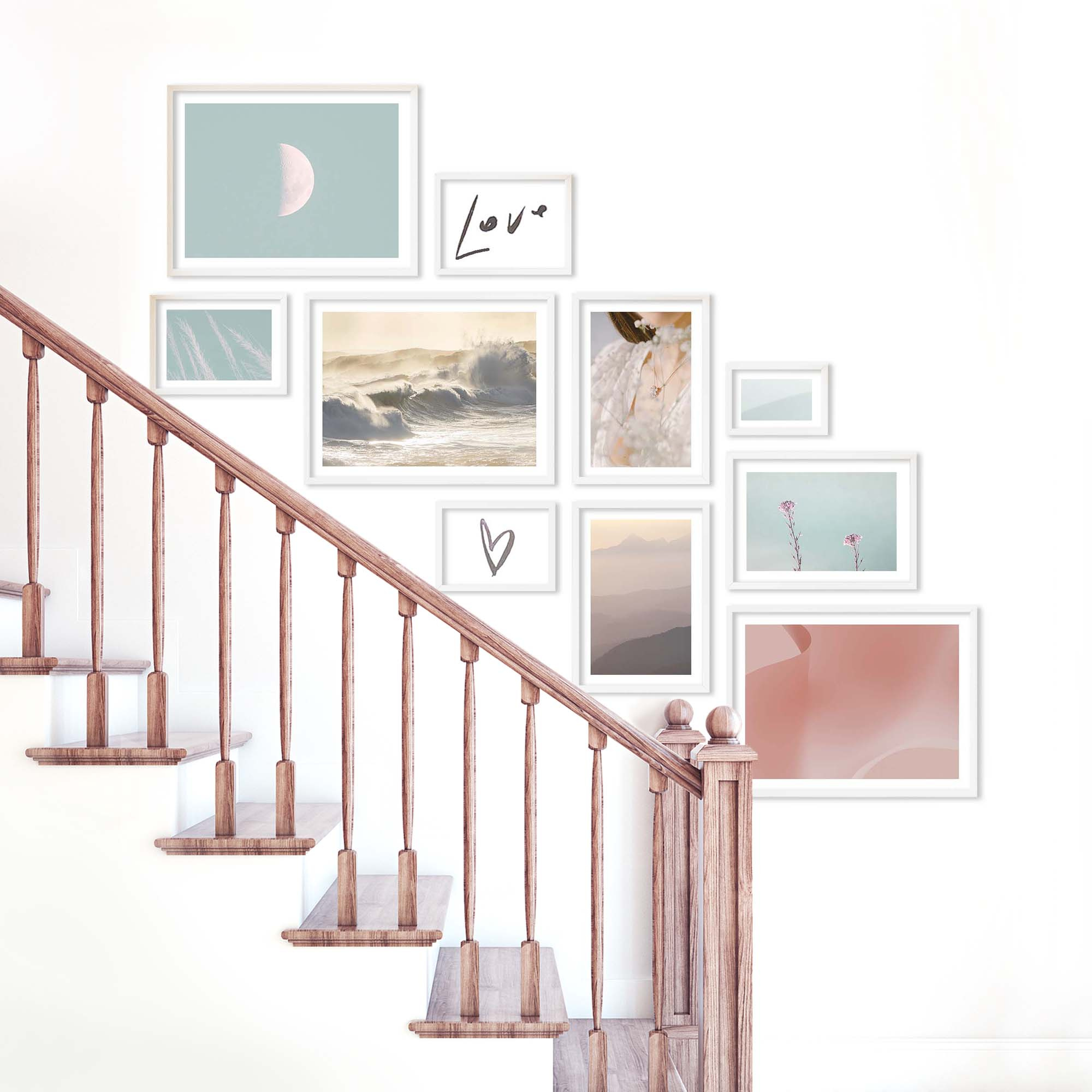 Zawieszenie kilku ramek na jednej ścianie tworzy ciekawą koncepcję, która stanowić będzie rewelacyjną ozdobę przestrzeni nad schodami. Proste ramki na zdjęcia to idealny pomysł, aby zapamiętać wyjątkowe chwile na długi czas.