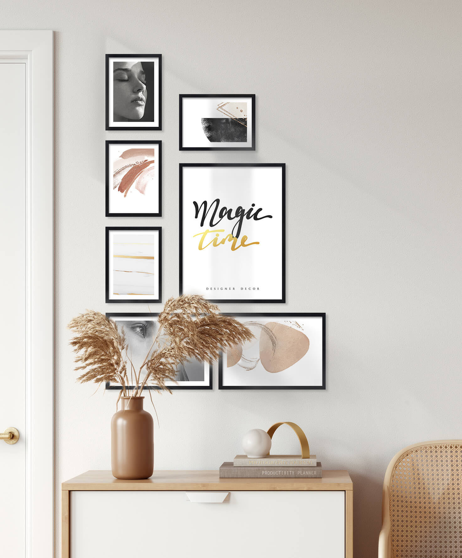 Nowoczesne galerie ścienne to prosty i efektowny sposób na aranżację każdego wnętrza. Dekoracyjny produkt pozwala stworzyć niebanalną kompozycję składającą się z 7 sztuk ramek. Wszystkie ramki zostały wykonane w 100% z drewna wysokiej jakości, dzięki czemu są trwałe i solidne. Galerie ścienne są lekkie i mają subtelny wygląd, co sprawia, że doskonale wyeksponują Twoje fotografie, grafiki oraz plakaty. Klasyczne profile o przekroju 11x14 mm sprawiają, że każda galeria ścienna będzie ponadczasowym dodatkiem do wnętrza. Warto podkreślić, że drewniane przekroje połączone zostały metodą “V-nail”, co wpływa na precyzyjne połączenie narożników.