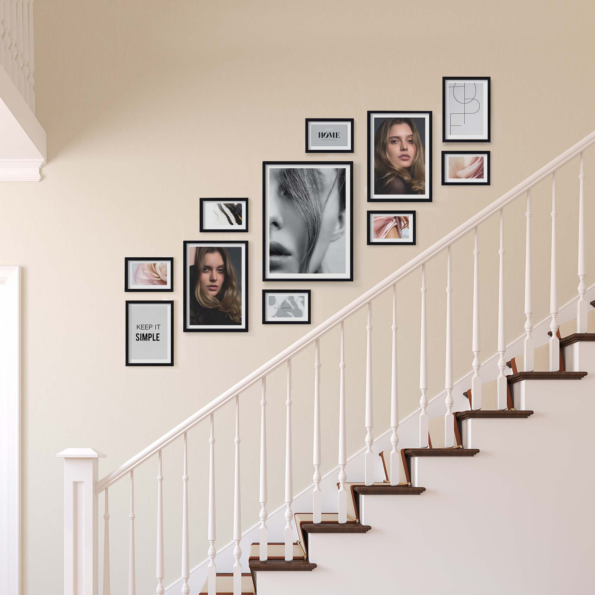 Nowoczesne galerie ścienne to prosty i efektowny sposób na aranżację ściany przy schodach. Dekoracyjny produkt pozwala stworzyć niebanalną kompozycję składającą się z 11 sztuk ramek. Wszystkie ramki zostały wykonane w 100% z drewna wysokiej jakości, dzięki czemu są trwałe i solidne. Galerie ścienne są lekkie i mają subtelny wygląd, co sprawia, że doskonale wyeksponują Twoje fotografie, grafiki oraz plakaty. Klasyczne profile o przekroju 11x14 mm sprawiają, że każda galeria ścienna będzie ponadczasowym dodatkiem do wnętrza. Warto podkreślić, że drewniane przekroje połączone zostały metodą “V-nail”, co wpływa na precyzyjne połączenie narożników.