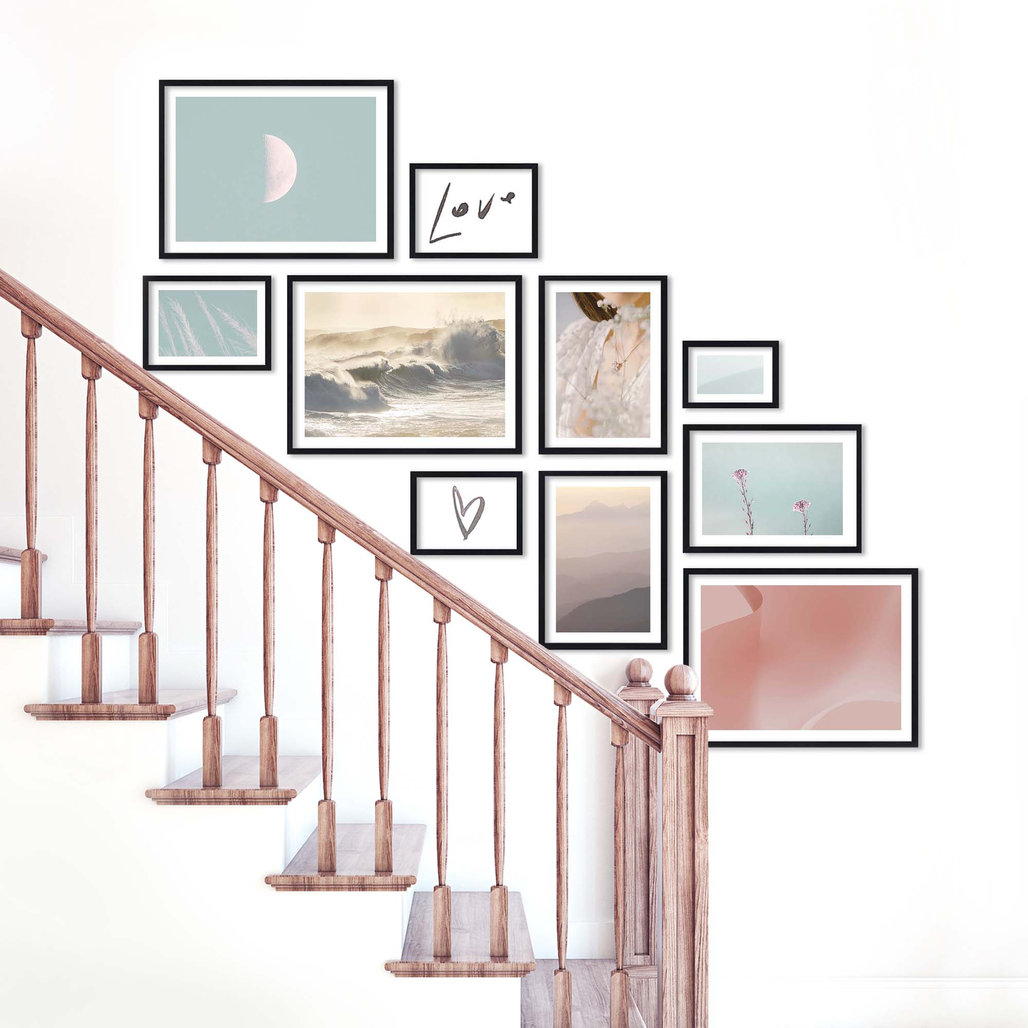 Zawieszenie kilku ramek na jednej ścianie tworzy ciekawą koncepcję, która stanowić będzie rewelacyjną ozdobę przestrzeni nad schodami. Proste ramki na zdjęcia to idealny pomysł, aby zapamiętać wyjątkowe chwile na długi czas.