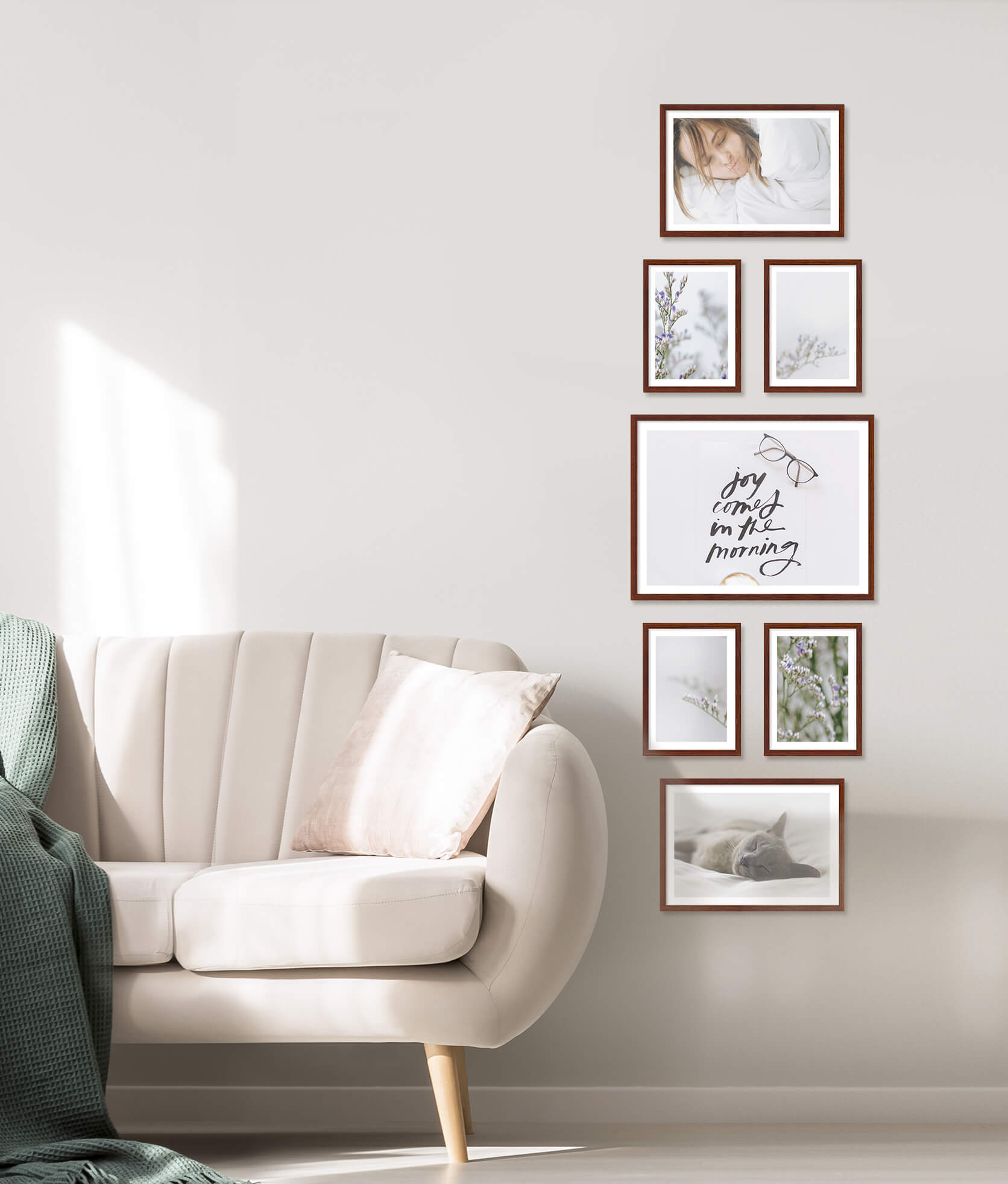 Nowoczesne galerie ścienne to prosty i efektowny sposób na aranżację każdego wnętrza. Dekoracyjny produkt pozwala stworzyć niebanalną kompozycję składającą się z 7 sztuk ramek. Wszystkie ramki zostały wykonane w 100% z drewna wysokiej jakości, dzięki czemu są trwałe i solidne. Galerie ścienne są lekkie i mają subtelny wygląd, co sprawia, że doskonale wyeksponują Twoje fotografie, grafiki oraz plakaty. Klasyczne profile o przekroju 11x14 mm sprawiają, że każda galeria ścienna będzie ponadczasowym dodatkiem do wnętrza. Warto podkreślić, że drewniane przekroje połączone zostały metodą “V-nail”, co wpływa na precyzyjne połączenie narożników.
