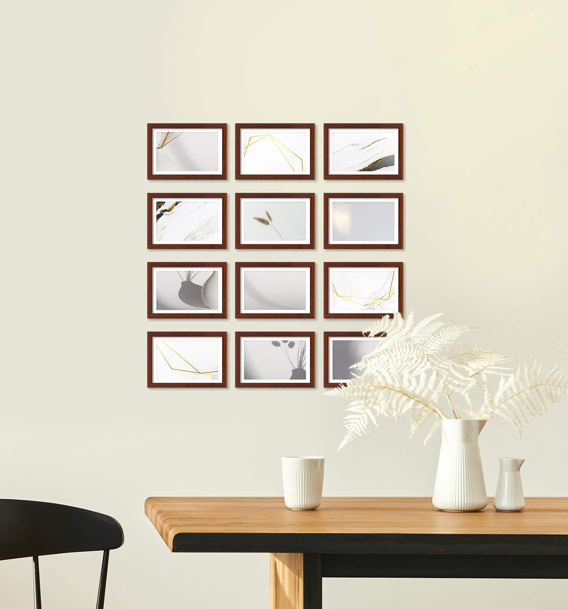 Nowoczesne galerie ścienne to prosty i efektowny sposób na aranżację każdego wnętrza. Dekoracyjny produkt pozwala stworzyć niebanalną kompozycję składającą się z 12 sztuk ramek. Wszystkie ramki zostały wykonane w 100% z drewna wysokiej jakości, dzięki czemu są trwałe i solidne. Galerie ścienne są lekkie i mają subtelny wygląd, co sprawia, że doskonale wyeksponują Twoje fotografie, grafiki oraz plakaty. Klasyczne profile o przekroju 11x14 mm sprawiają, że każda galeria ścienna będzie ponadczasowym dodatkiem do wnętrza. Warto podkreślić, że drewniane przekroje połączone zostały metodą “V-nail”, co wpływa na precyzyjne połączenie narożników.