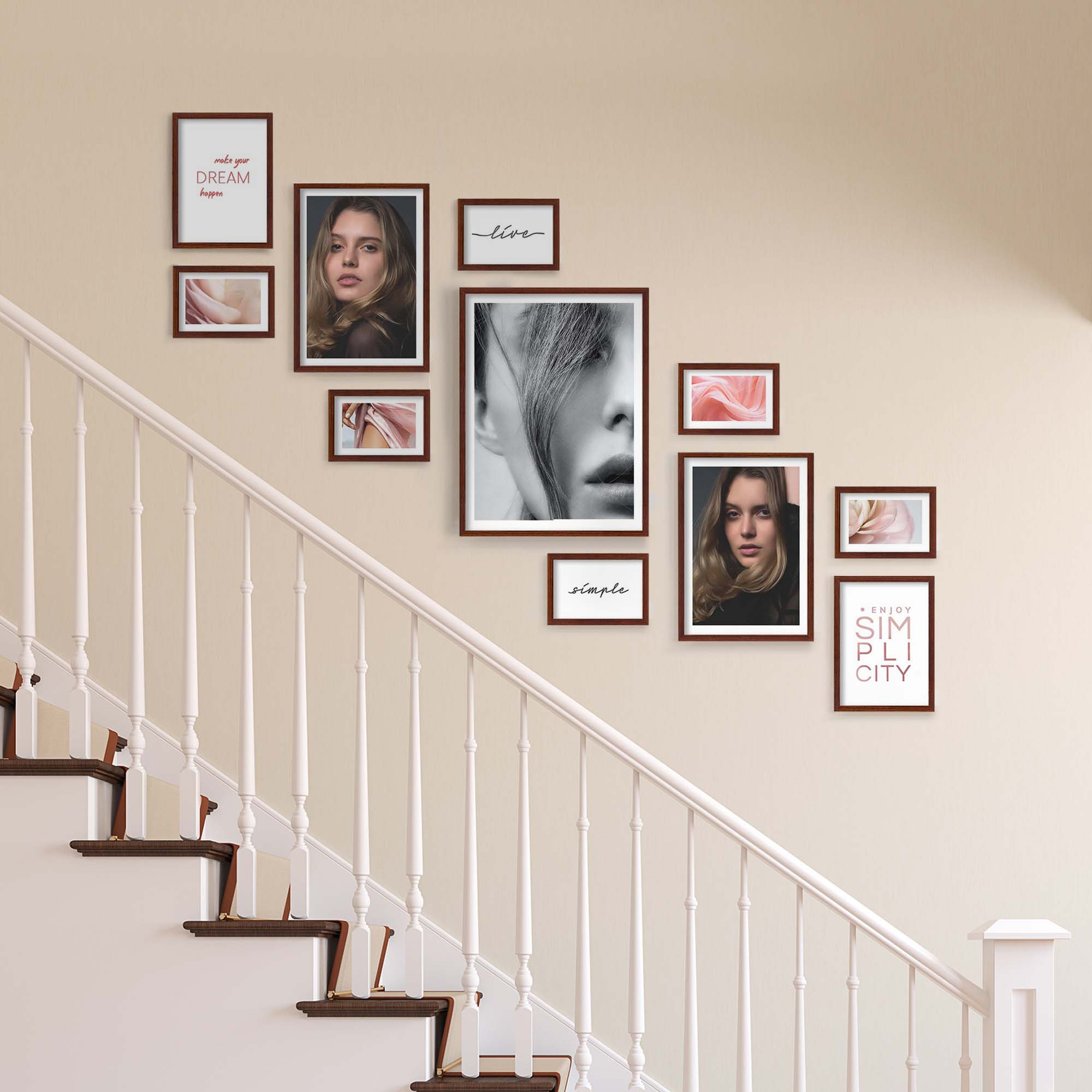 Nowoczesne galerie ścienne to prosty i efektowny sposób na aranżację ściany przy schodach. Dekoracyjny produkt pozwala stworzyć niebanalną kompozycję składającą się z 11 sztuk ramek. Wszystkie ramki zostały wykonane w 100% z drewna wysokiej jakości, dzięki czemu są trwałe i solidne. Galerie ścienne są lekkie i mają subtelny wygląd, co sprawia, że doskonale wyeksponują Twoje fotografie, grafiki oraz plakaty. Klasyczne profile o przekroju 11x14 mm sprawiają, że każda galeria ścienna będzie ponadczasowym dodatkiem do wnętrza. Warto podkreślić, że drewniane przekroje połączone zostały metodą “V-nail”, co wpływa na precyzyjne połączenie narożników.